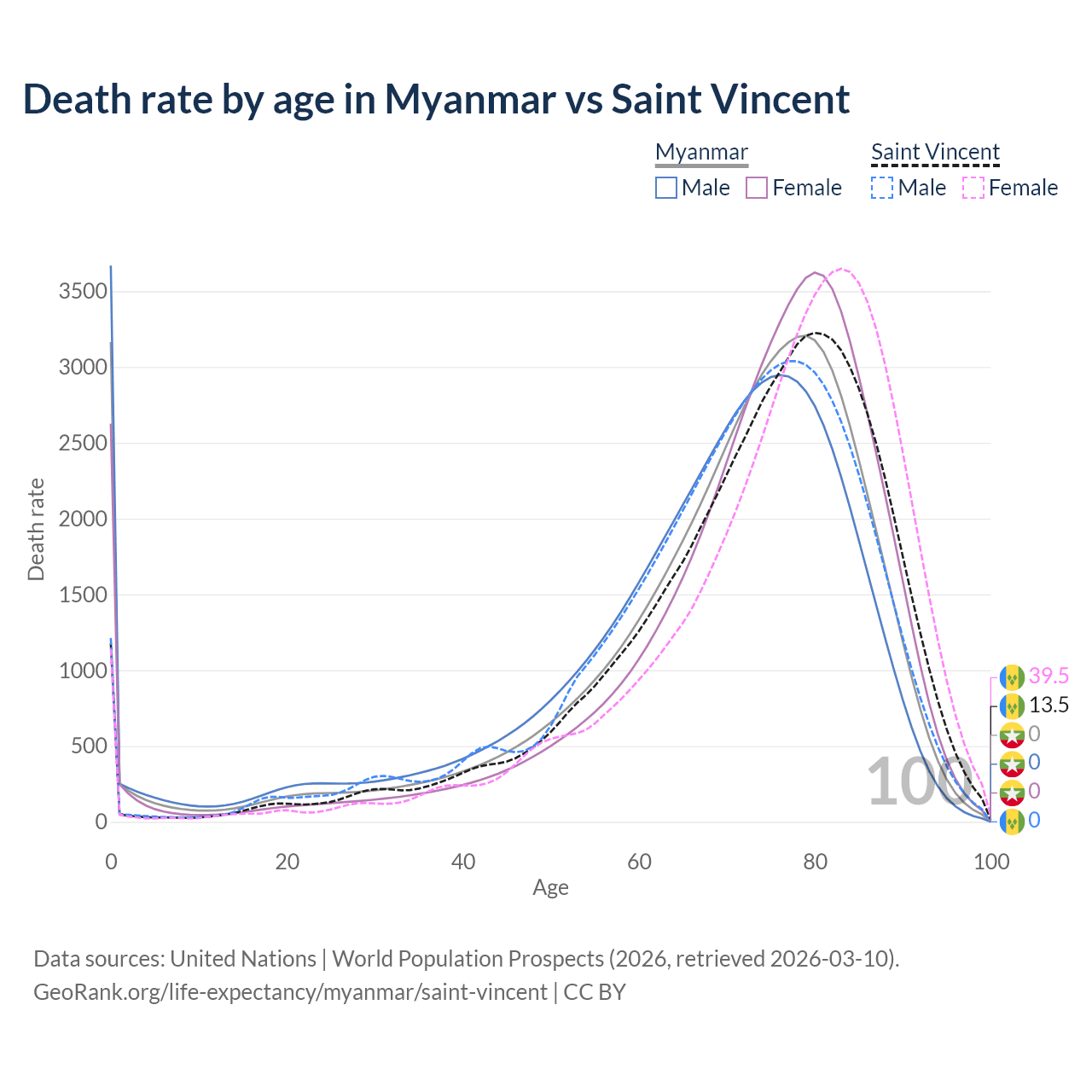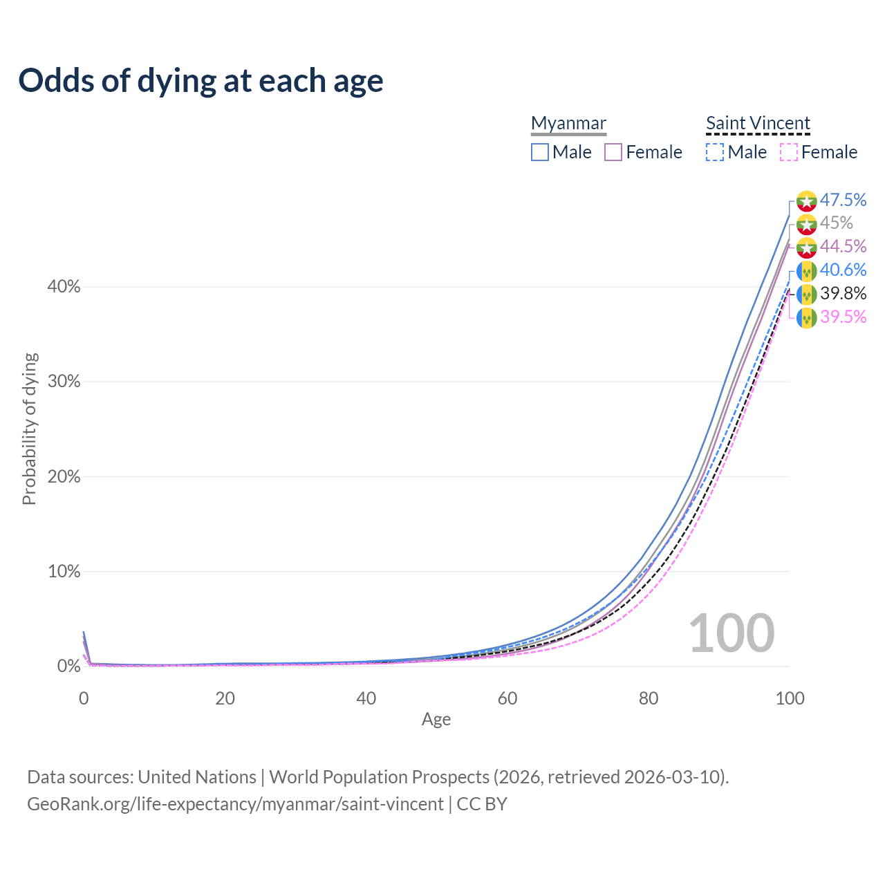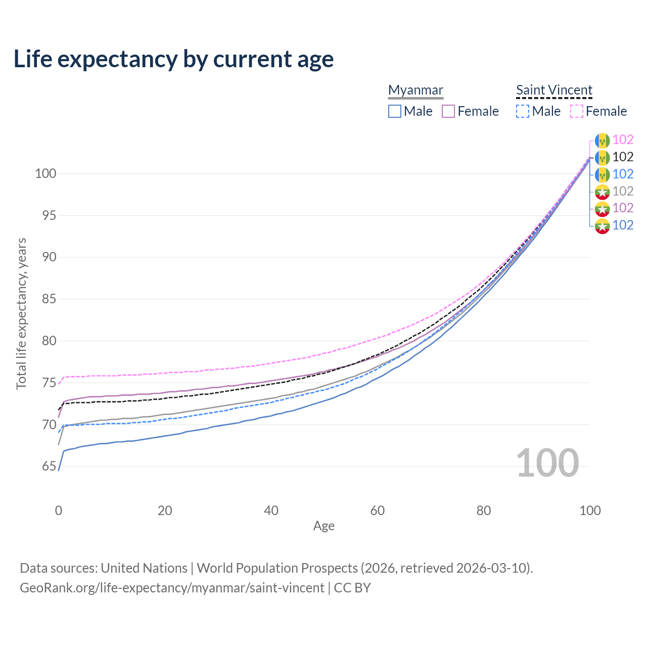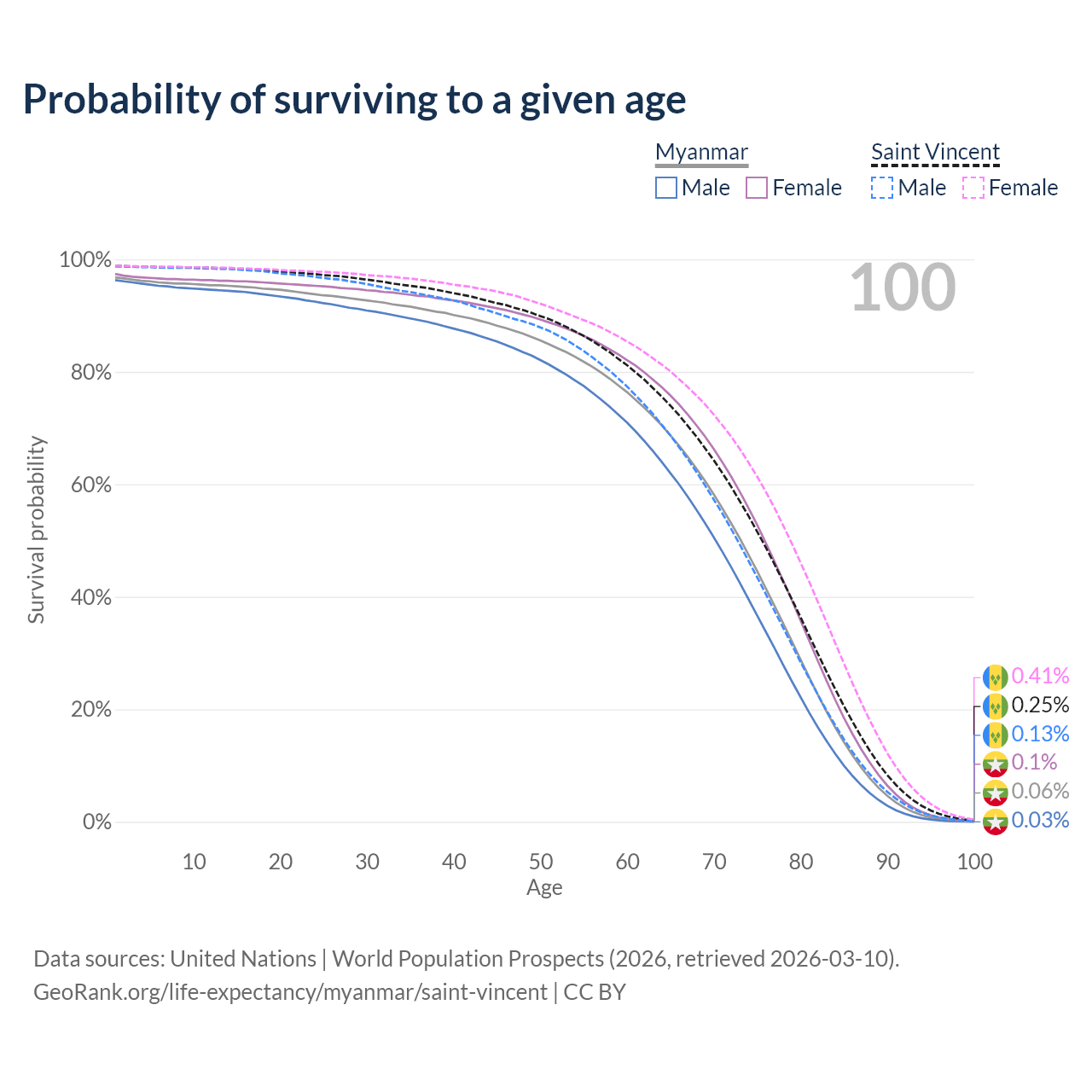 This life expectancy calculator shows the odds of living to 100, 95, 90, and below based on current age for both males and females in Myanmar and Saint Vincent, along with mean and median age of death. The calculations are based on the 2026 life tables (actuarial tables) from the UN World Population Prospects.