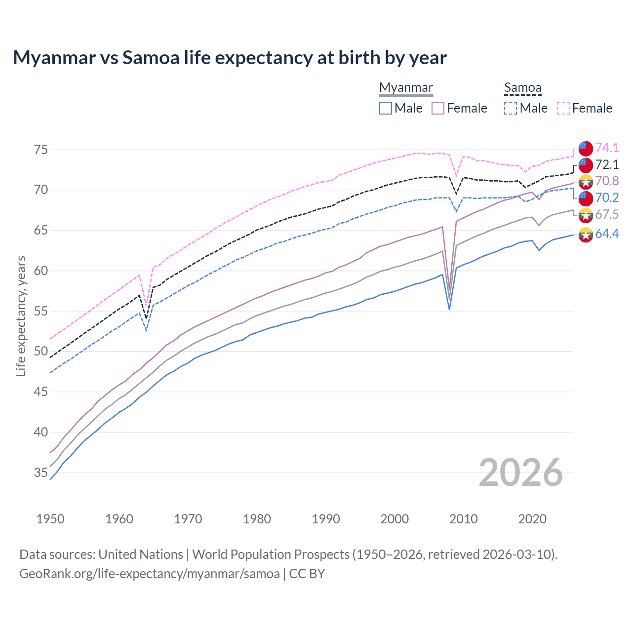 The average life expectancy at birth is 67.5 years in Myanmar vs 72.1 in Samoa. Myanmar is ranked 157/197 by life expectancy, and Samoa is 124/197. In Myanmar, the life expectancy is 64.4 years for males and 70.8 years for females. In Samoa, it's 70.2 years for males and 74.1 years for females.