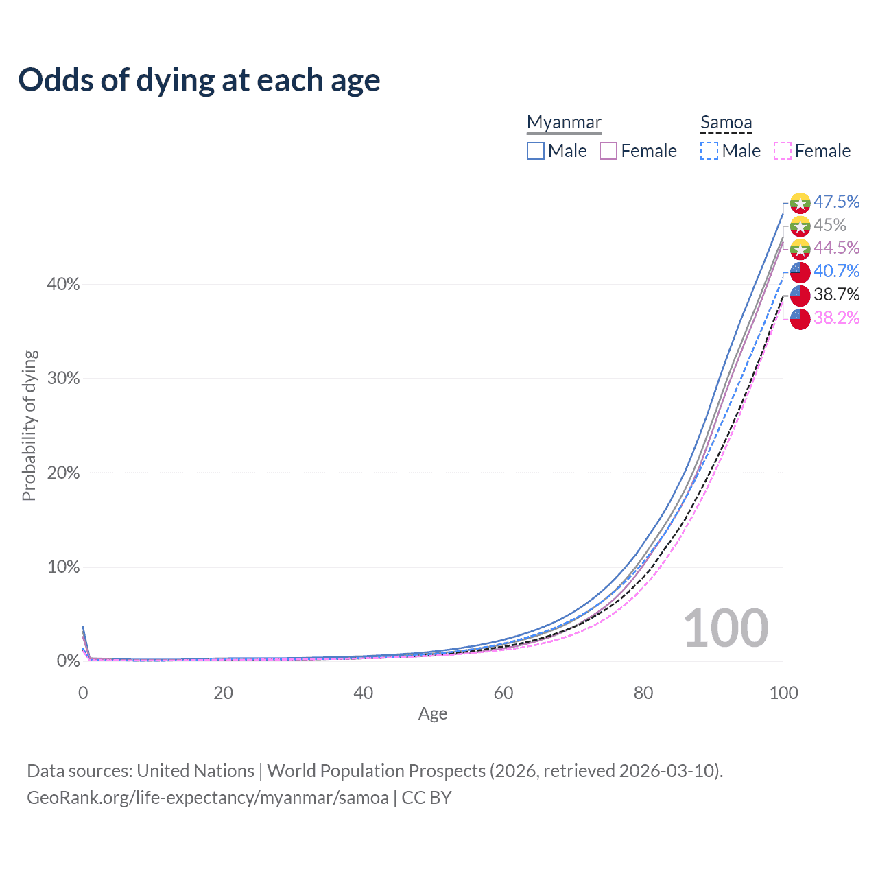 This life expectancy calculator shows the odds of living to 100, 95, 90, and below based on current age for both males and females in Myanmar and Samoa, along with mean and median age of death. The calculations are based on the 2026 life tables (actuarial tables) from the UN World Population Prospects.