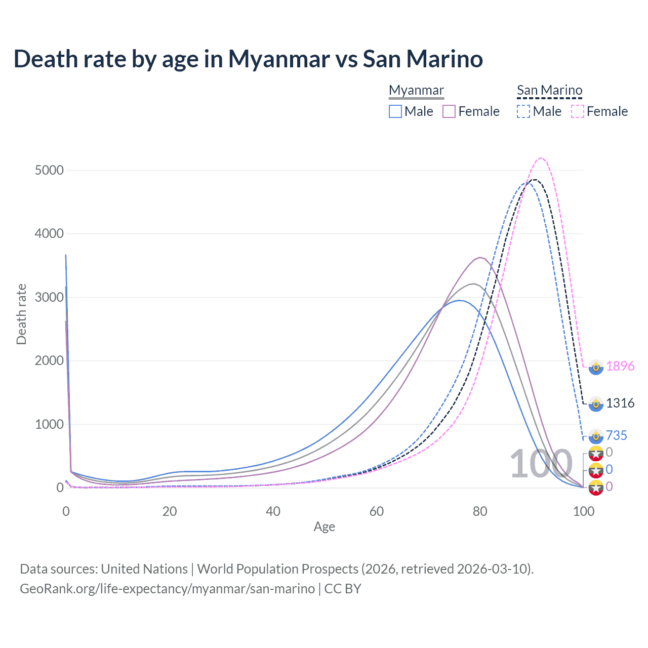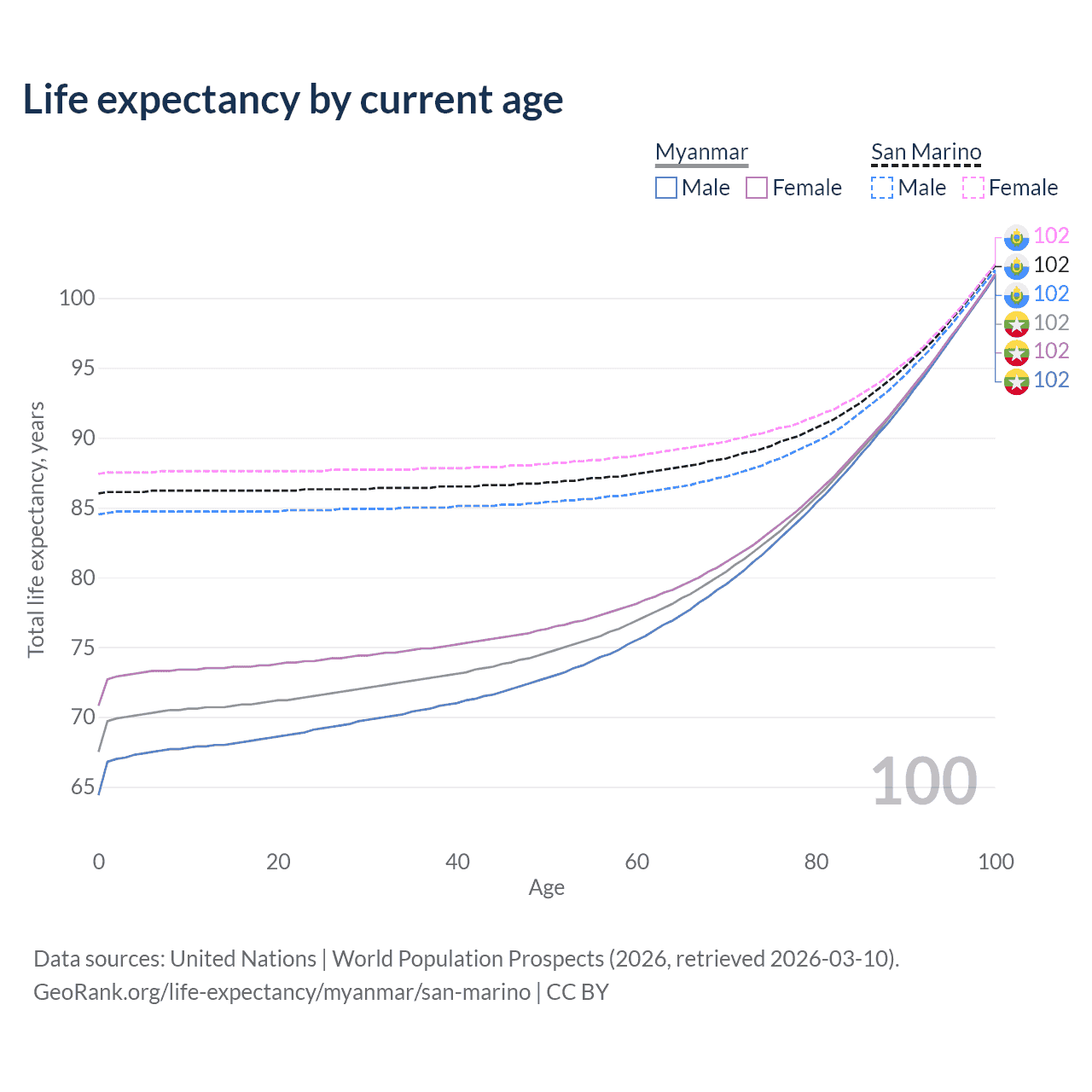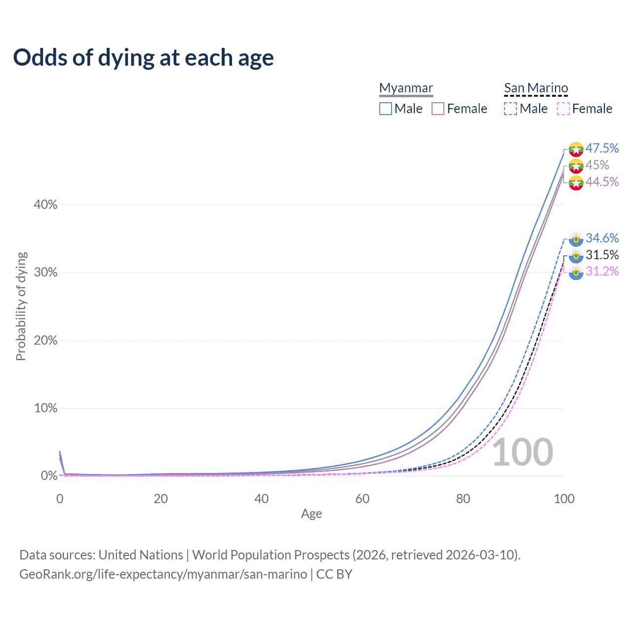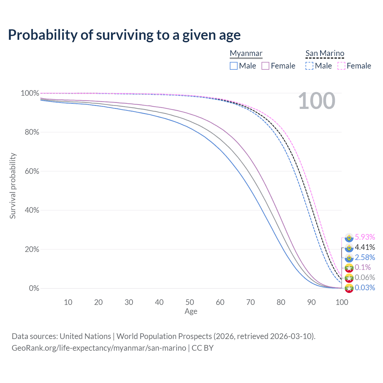 This life expectancy calculator shows the odds of living to 100, 95, 90, and below based on current age for both males and females in Myanmar and San Marino, along with mean and median age of death. The calculations are based on the 2026 life tables (actuarial tables) from the UN World Population Prospects.