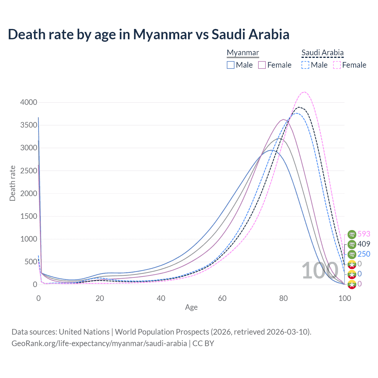 In Myanmar, the most common age of death is 79, compared to 85 in Saudi Arabia. The median age of death is 73.1 in Myanmar and 82.5 in Saudi Arabia, meaning only half of each cohort is expected to live past that age.