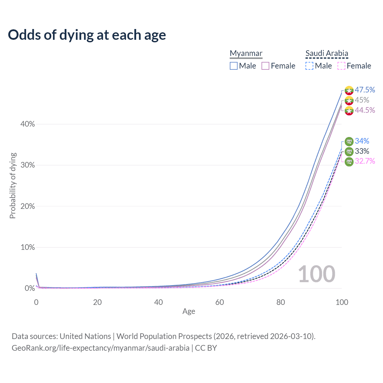 This life expectancy calculator shows the odds of living to 100, 95, 90, and below based on current age for both males and females in Myanmar and Saudi Arabia, along with mean and median age of death. The calculations are based on the 2026 life tables (actuarial tables) from the UN World Population Prospects.