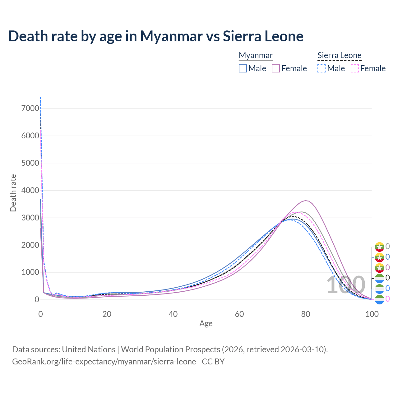 In Myanmar, the most common age of death is 79, compared to 0 in Sierra Leone. The median age of death is 73.1 in Myanmar and 70.8 in Sierra Leone, meaning only half of each cohort is expected to live past that age.