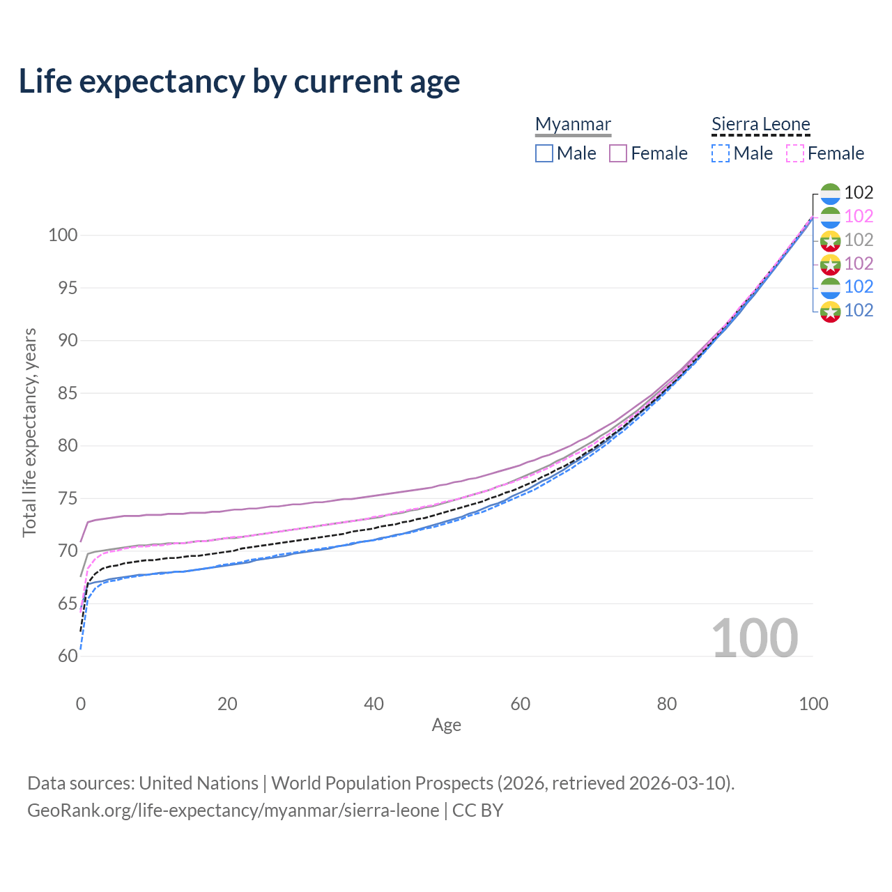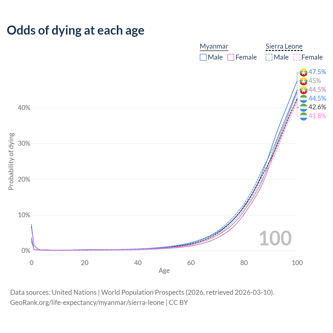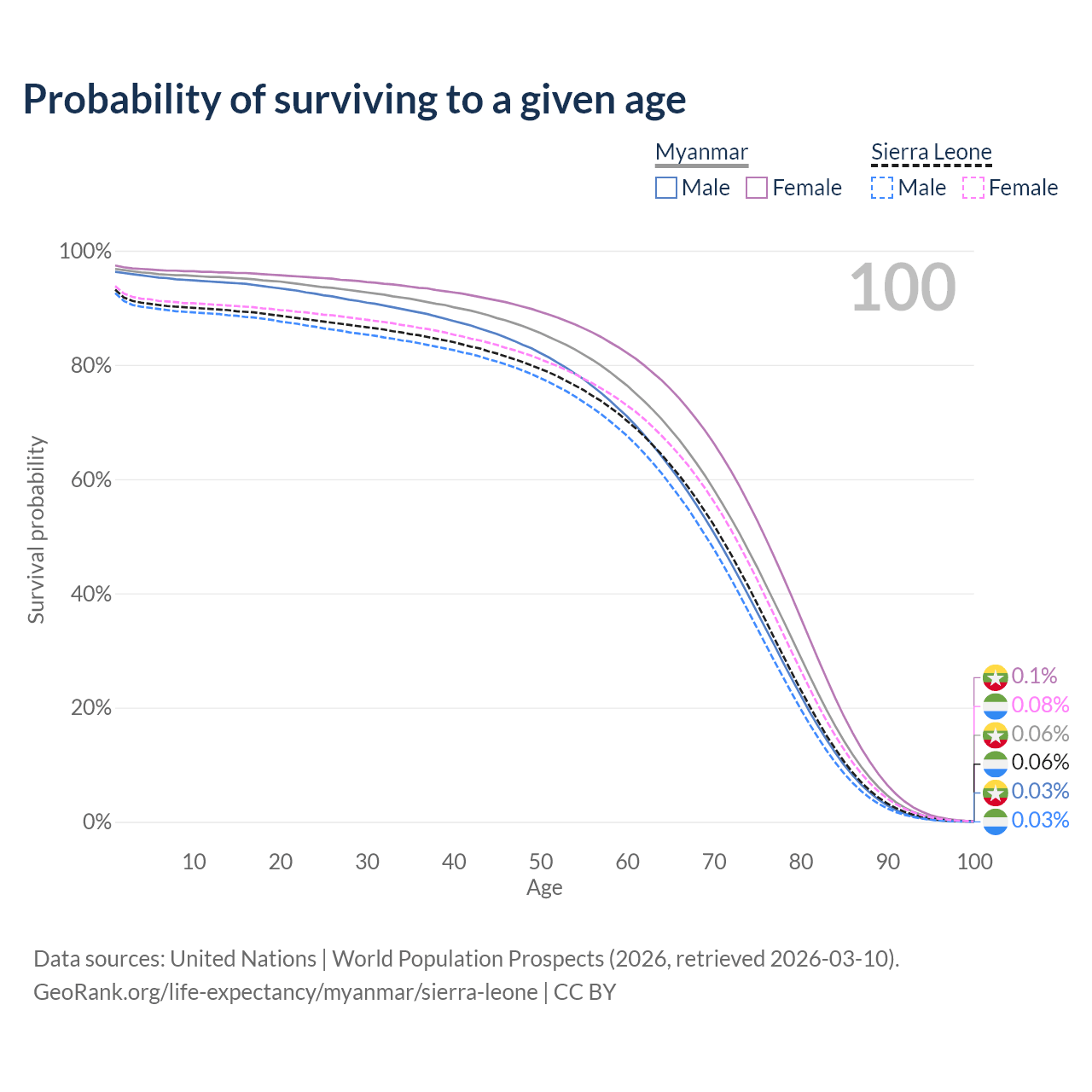 This life expectancy calculator shows the odds of living to 100, 95, 90, and below based on current age for both males and females in Myanmar and Sierra Leone, along with mean and median age of death. The calculations are based on the 2026 life tables (actuarial tables) from the UN World Population Prospects.