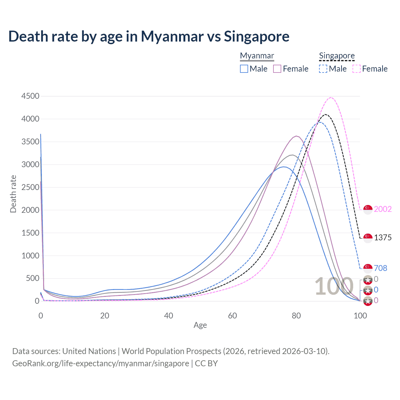 In Myanmar, the most common age of death is 79, compared to 89 in Singapore. The median age of death is 73.1 in Myanmar and 86.5 in Singapore, meaning only half of each cohort is expected to live past that age.