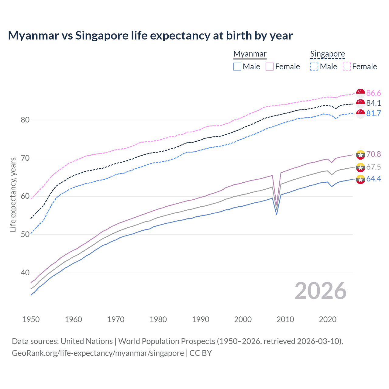 The average life expectancy at birth is 67.5 years in Myanmar vs 84.1 in Singapore. Myanmar is ranked 157/197 by life expectancy, and Singapore is 9/197. In Myanmar, the life expectancy is 64.4 years for males and 70.8 years for females. In Singapore, it's 81.7 years for males and 86.6 years for females.