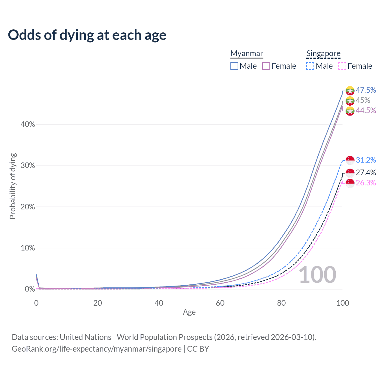 This life expectancy calculator shows the odds of living to 100, 95, 90, and below based on current age for both males and females in Myanmar and Singapore, along with mean and median age of death. The calculations are based on the 2026 life tables (actuarial tables) from the UN World Population Prospects.