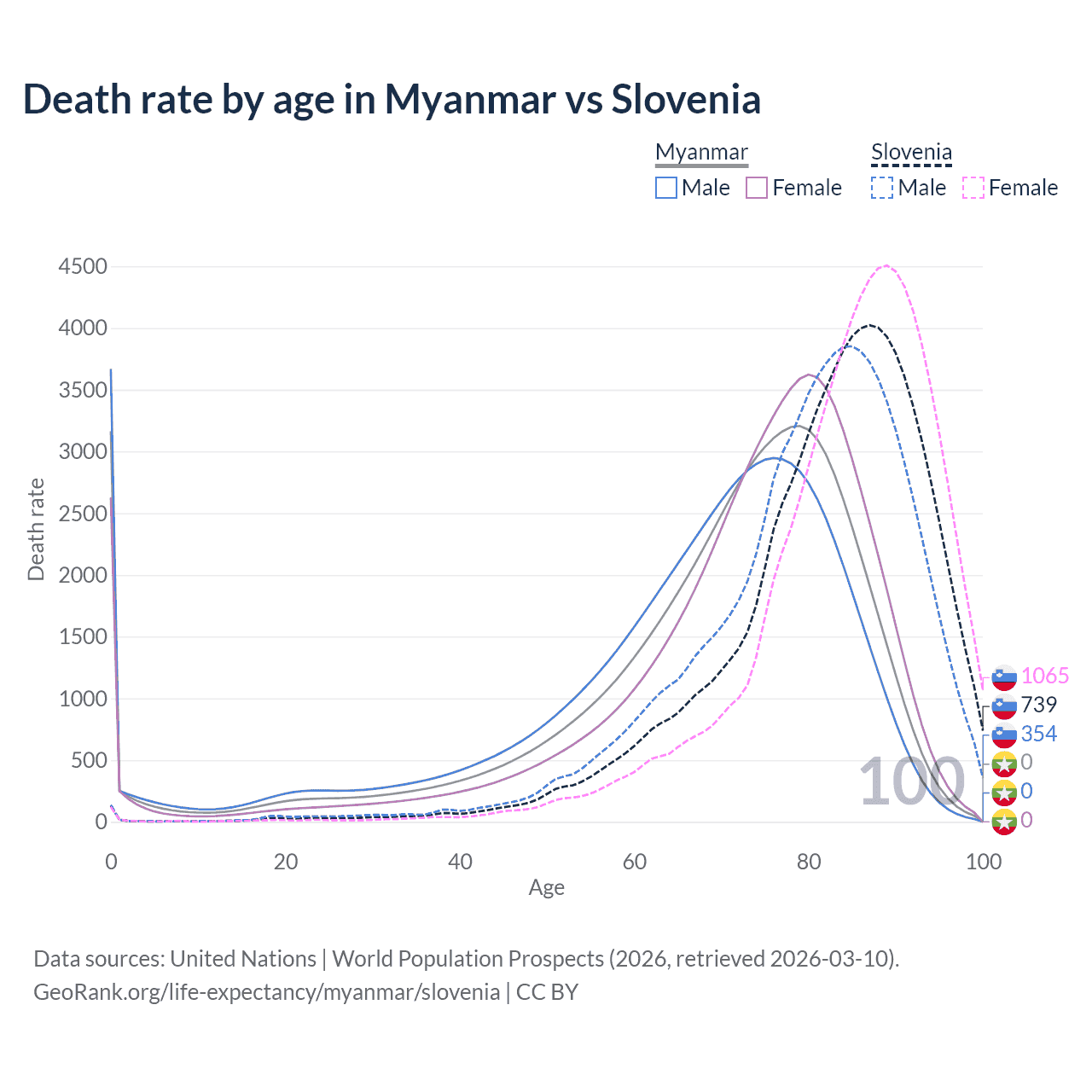 In Myanmar, the most common age of death is 79, compared to 87 in Slovenia. The median age of death is 73.1 in Myanmar and 84.4 in Slovenia, meaning only half of each cohort is expected to live past that age.