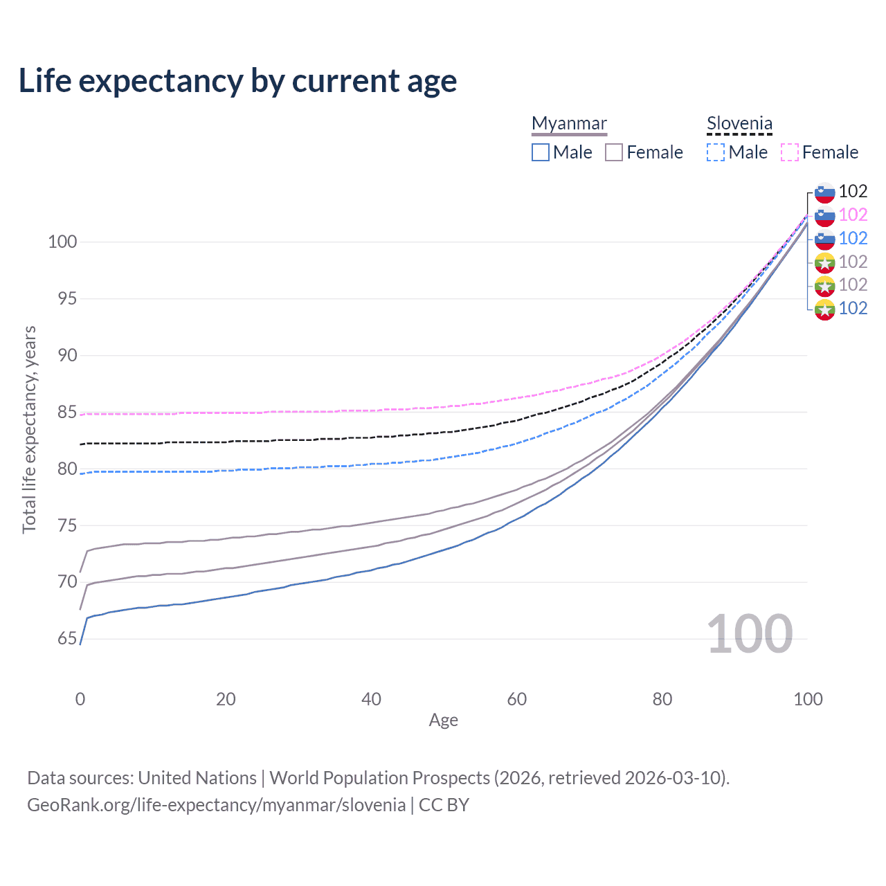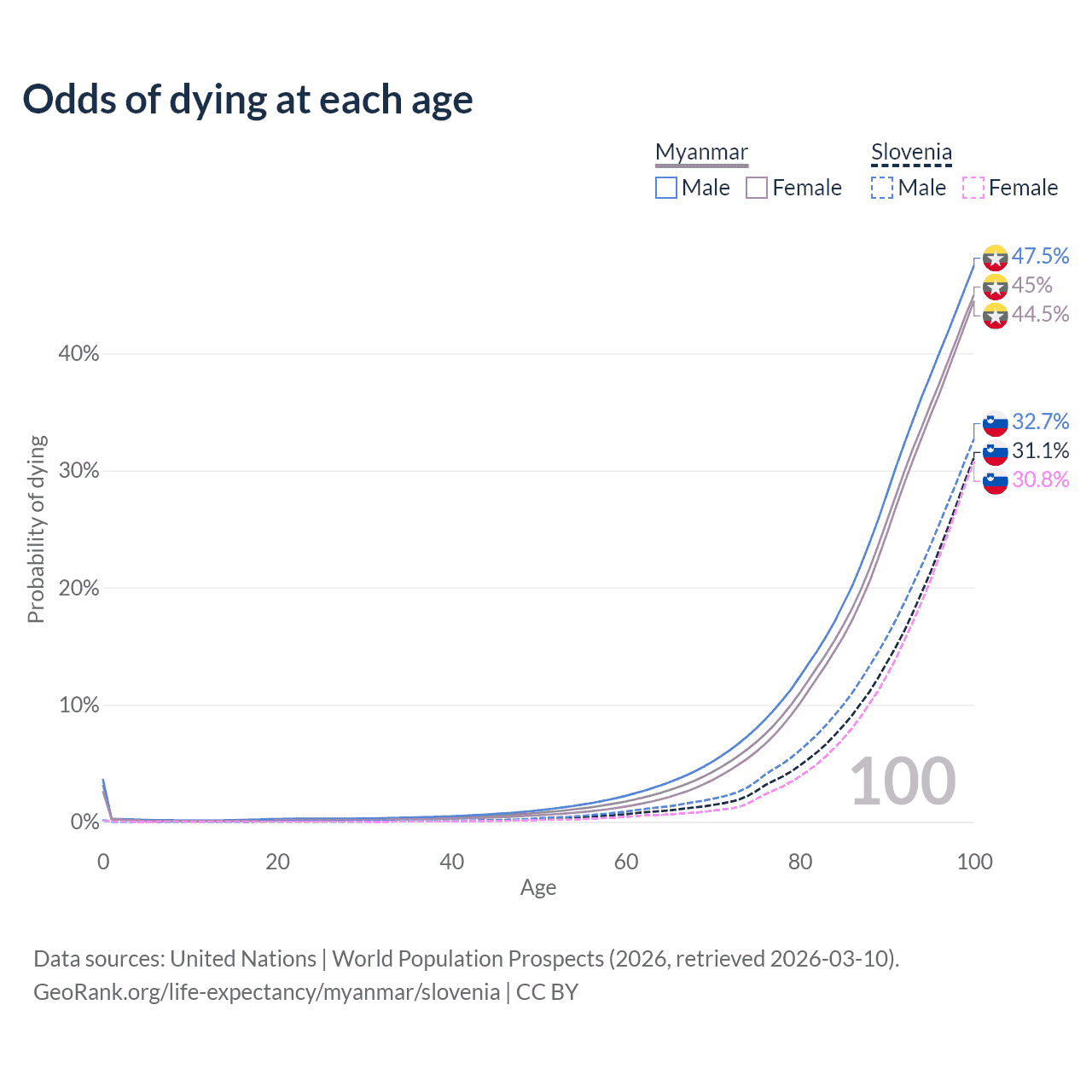 This life expectancy calculator shows the odds of living to 100, 95, 90, and below based on current age for both males and females in Myanmar and Slovenia, along with mean and median age of death. The calculations are based on the 2026 life tables (actuarial tables) from the UN World Population Prospects.