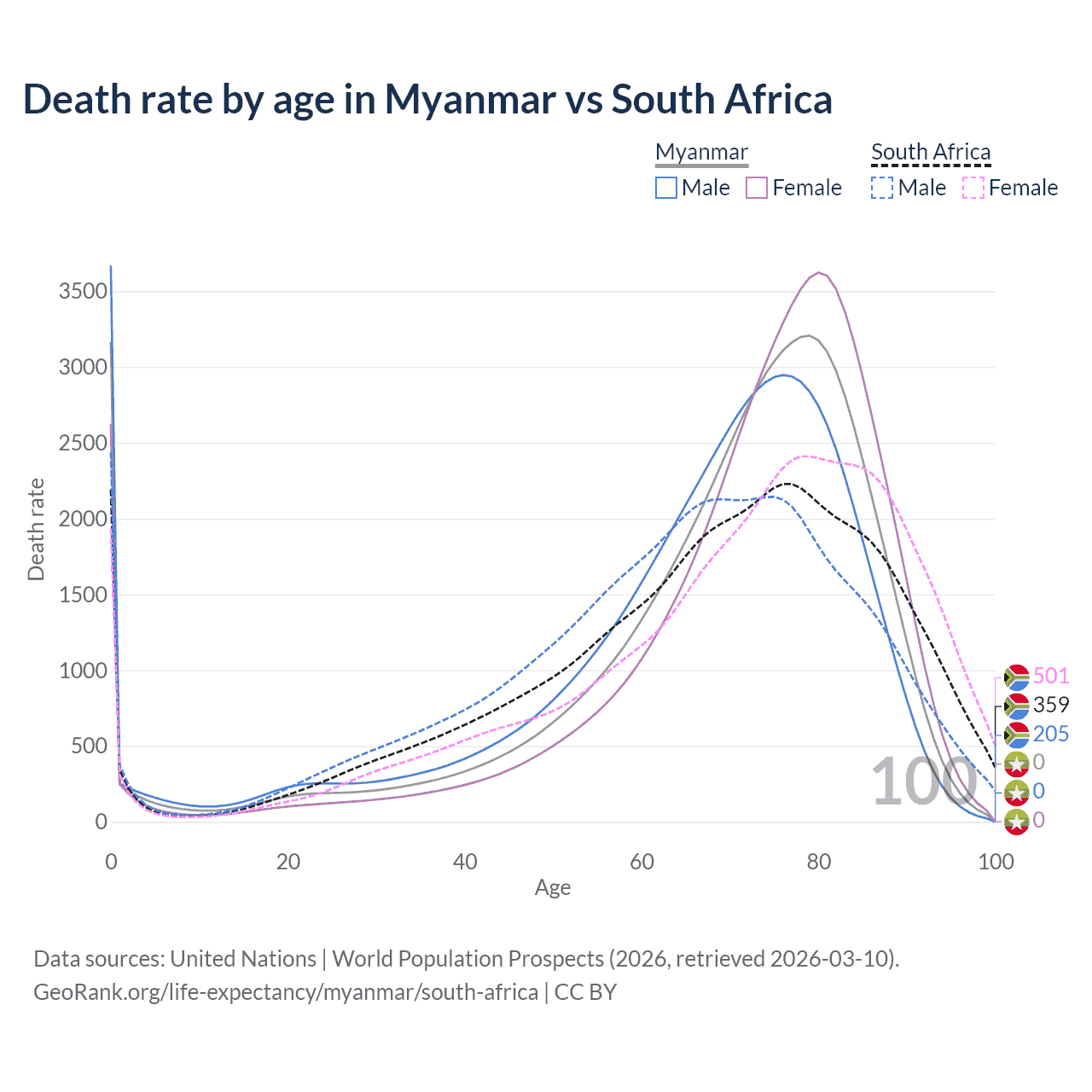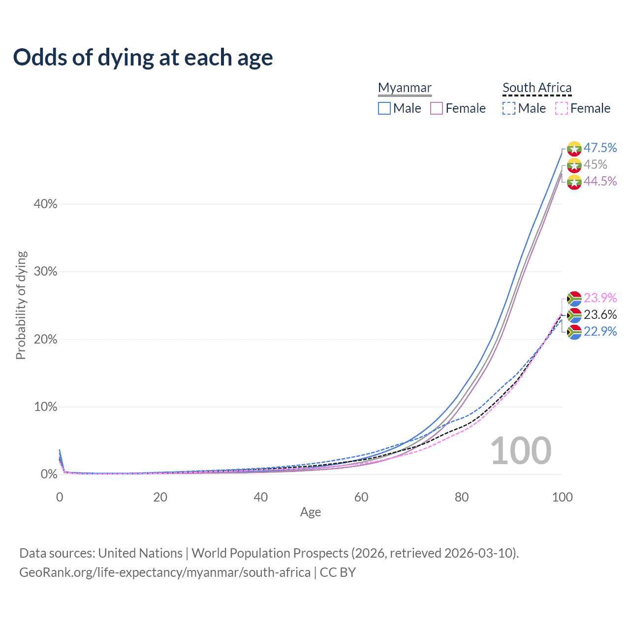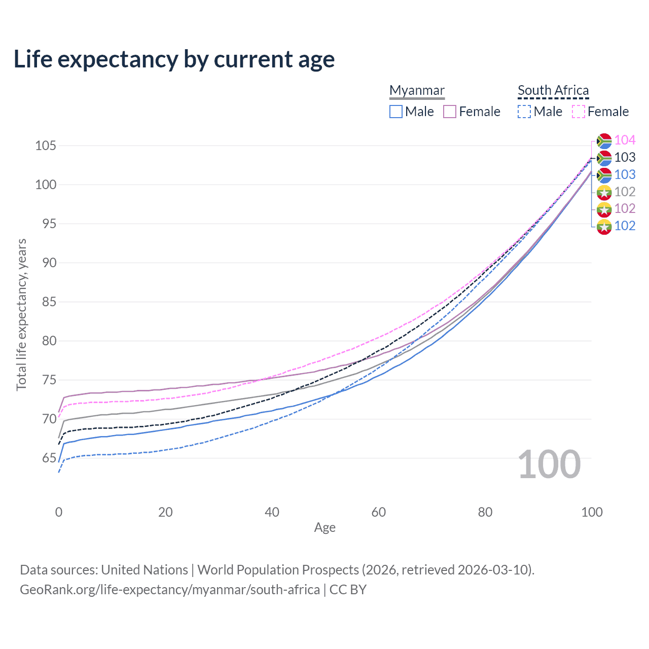 This life expectancy calculator shows the odds of living to 100, 95, 90, and below based on current age for both males and females in Myanmar and South Africa, along with mean and median age of death. The calculations are based on the 2026 life tables (actuarial tables) from the UN World Population Prospects.