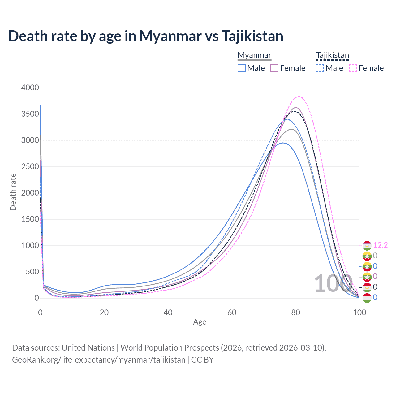 This life expectancy calculator shows the odds of living to 100, 95, 90, and below based on current age for both males and females in Myanmar and Tajikistan, along with mean and median age of death. The calculations are based on the 2026 life tables (actuarial tables) from the UN World Population Prospects.