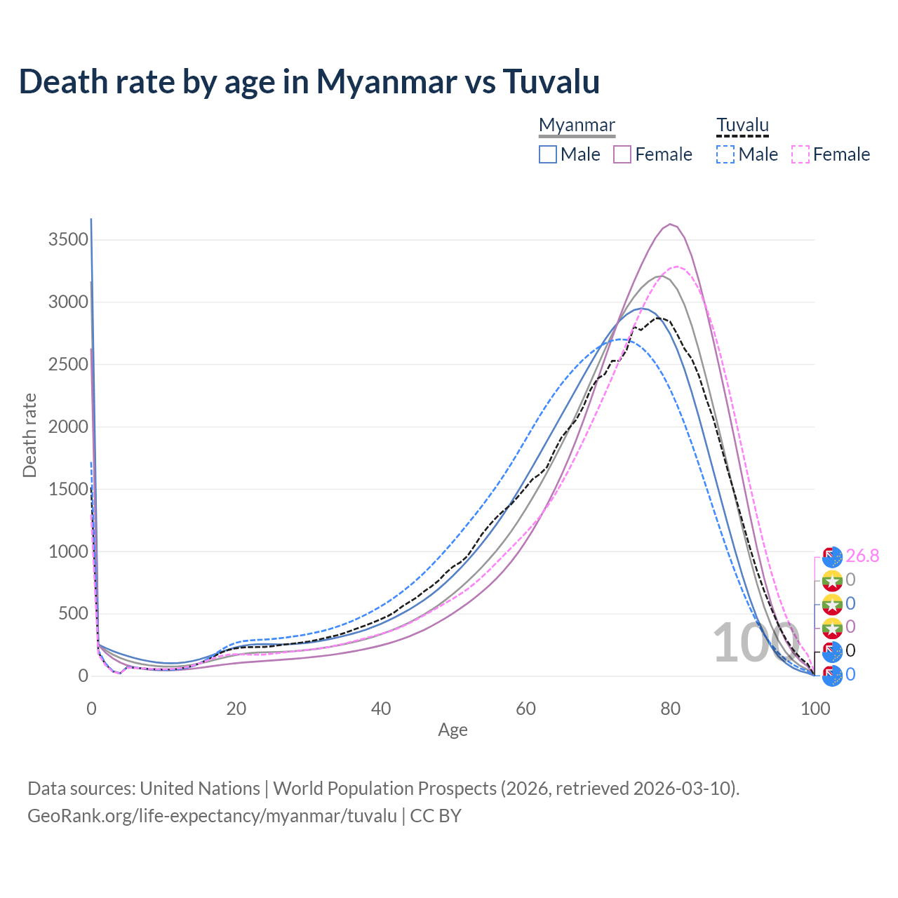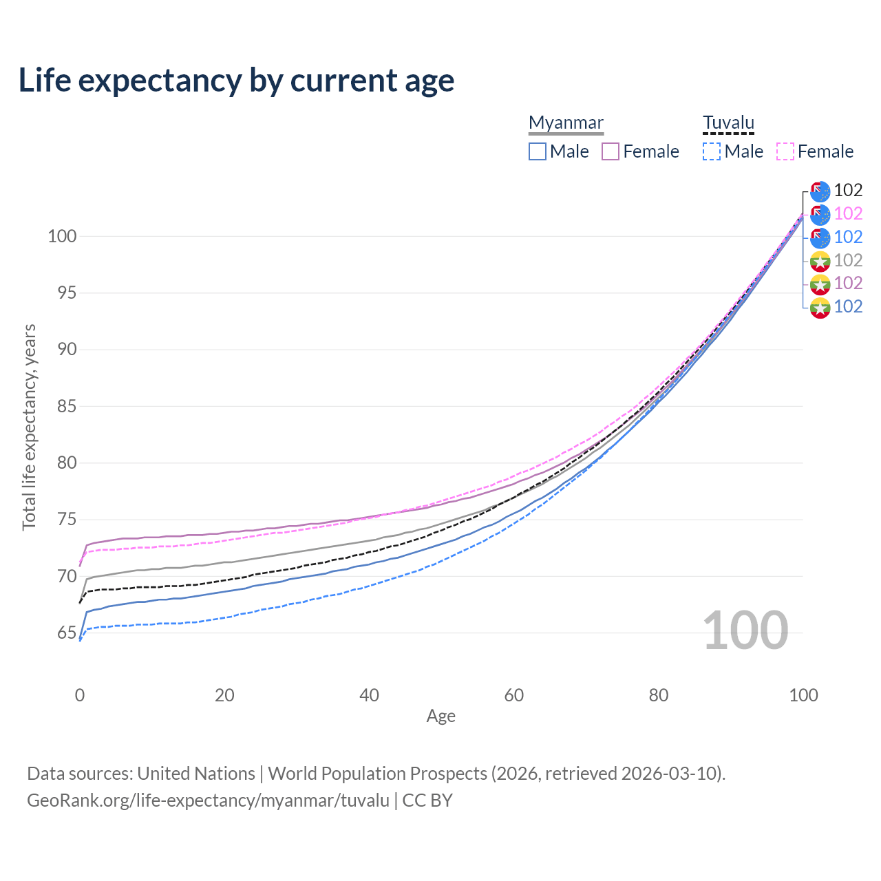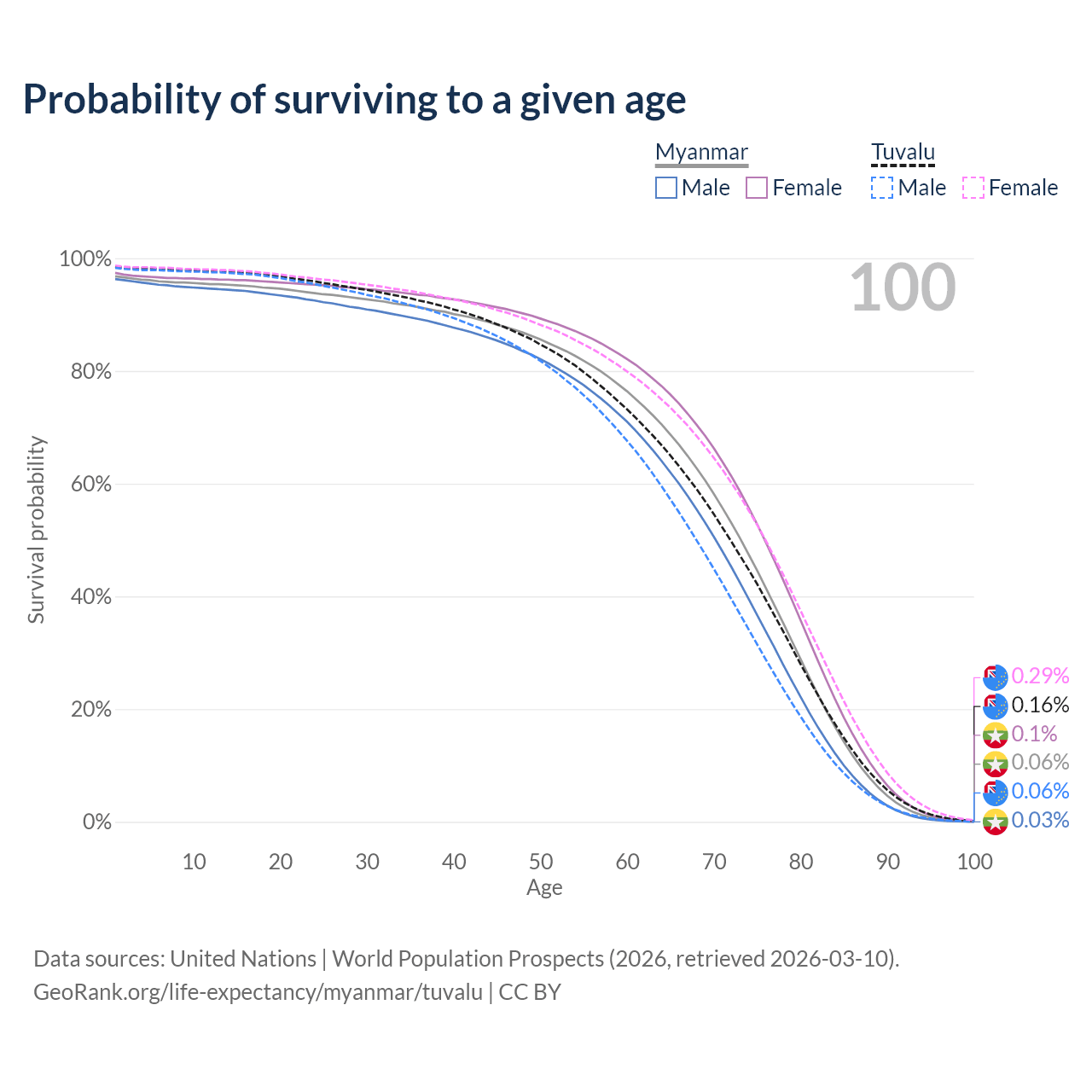 This life expectancy calculator shows the odds of living to 100, 95, 90, and below based on current age for both males and females in Myanmar and Tuvalu, along with mean and median age of death. The calculations are based on the 2026 life tables (actuarial tables) from the UN World Population Prospects.