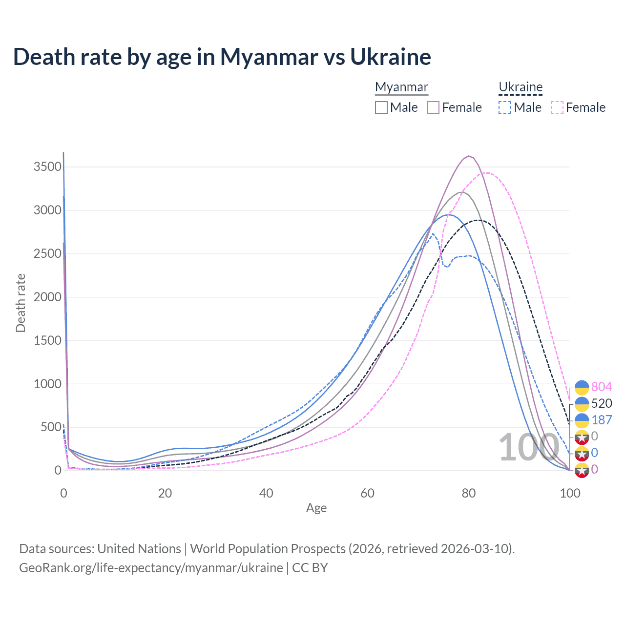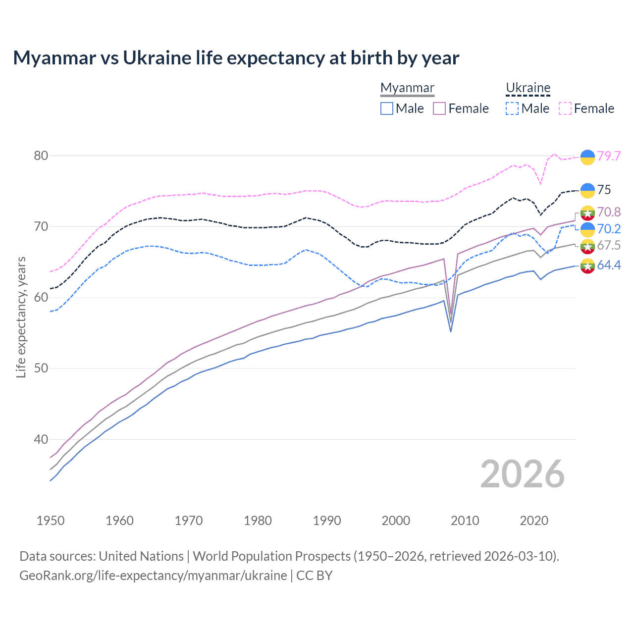 The average life expectancy at birth is 67.5 years in Myanmar vs 75 in Ukraine. Myanmar is ranked 157/197 by life expectancy, and Ukraine is 94/197. In Myanmar, the life expectancy is 64.4 years for males and 70.8 years for females. In Ukraine, it's 70.2 years for males and 79.7 years for females.
