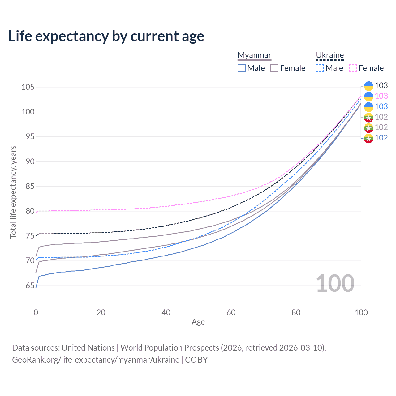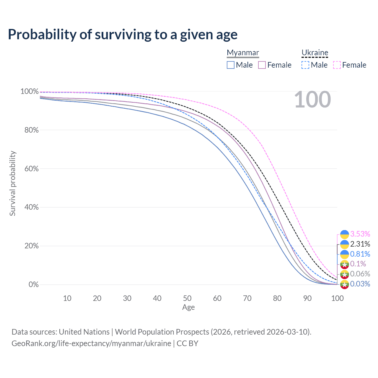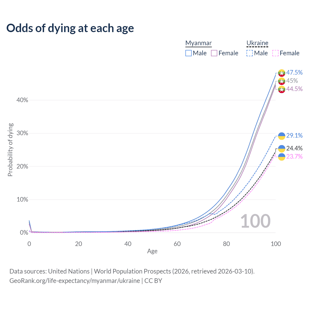 This life expectancy calculator shows the odds of living to 100, 95, 90, and below based on current age for both males and females in Myanmar and Ukraine, along with mean and median age of death. The calculations are based on the 2026 life tables (actuarial tables) from the UN World Population Prospects.