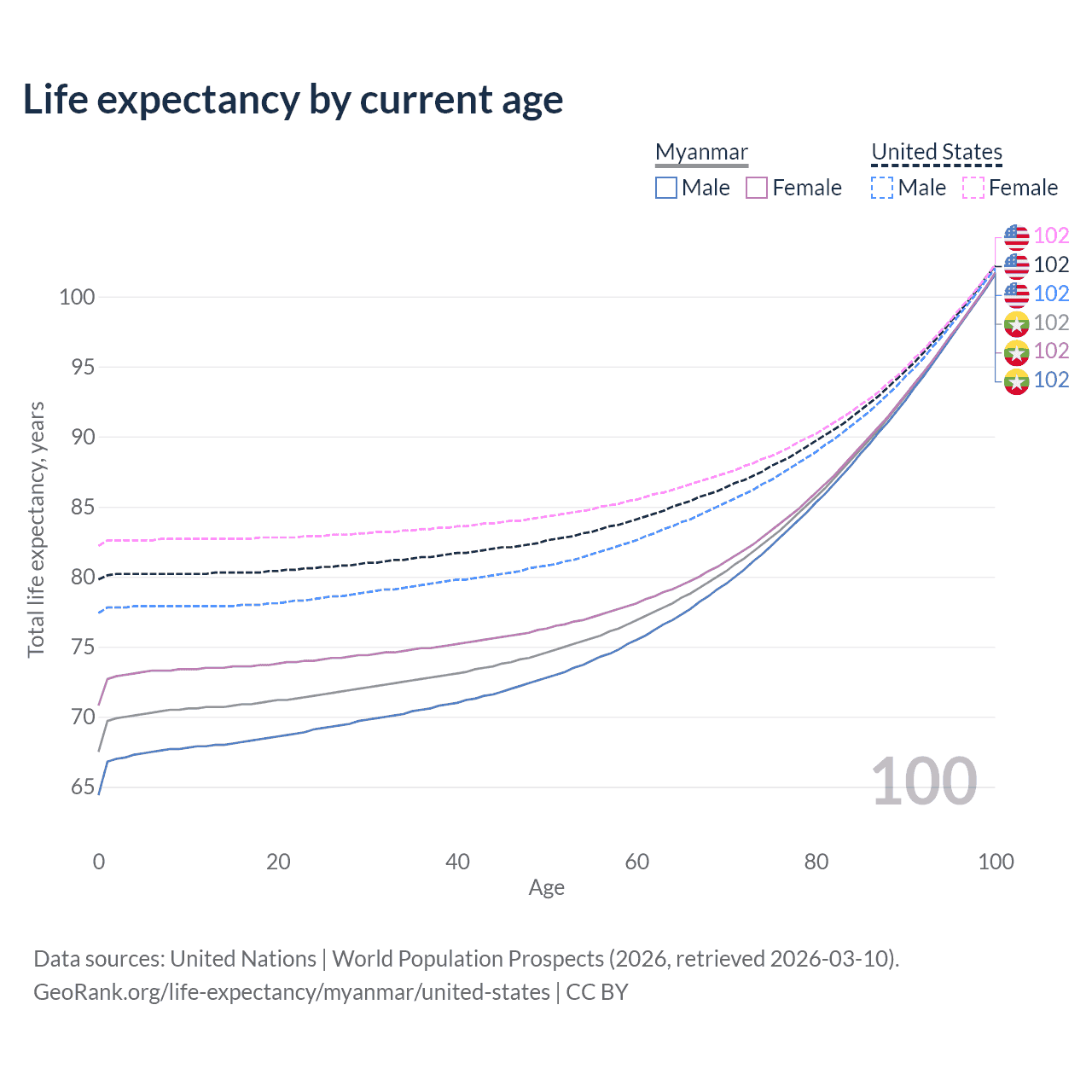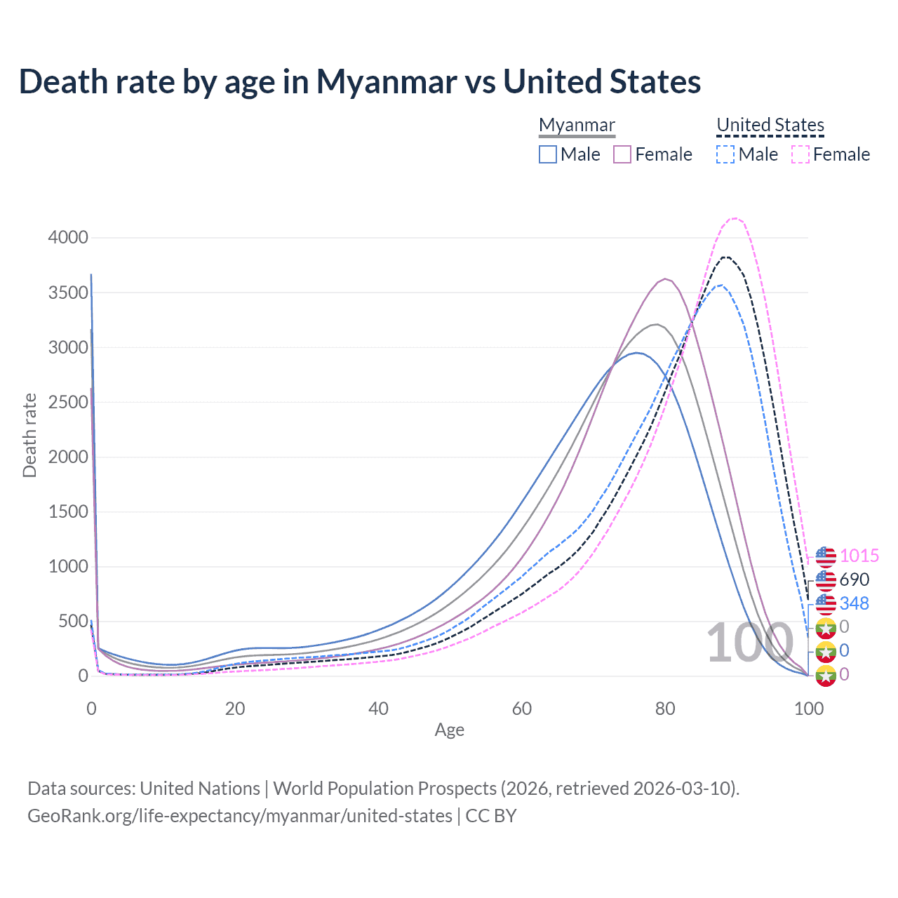 The average life expectancy at birth is 67.5 years in Myanmar vs 79.8 in the United States. Myanmar is ranked 157/197 by life expectancy, and the United States is 47/197. In Myanmar, the life expectancy is 64.4 years for males and 70.8 years for females. In the United States, it's 77.4 years for males and 82.2 years for females.
