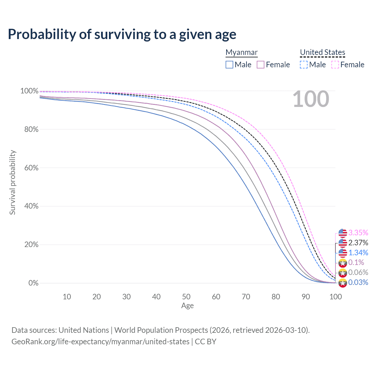 This life expectancy calculator shows the odds of living to 100, 95, 90, and below based on current age for both males and females in Myanmar and the United States, along with mean and median age of death. The calculations are based on the 2026 life tables (actuarial tables) from the UN World Population Prospects.