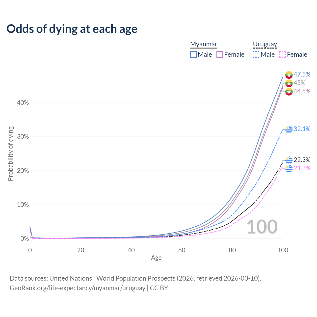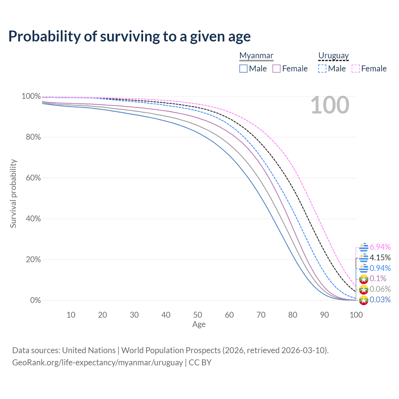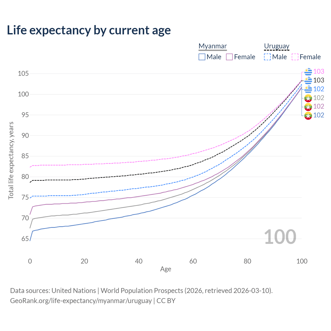 This life expectancy calculator shows the odds of living to 100, 95, 90, and below based on current age for both males and females in Myanmar and Uruguay, along with mean and median age of death. The calculations are based on the 2026 life tables (actuarial tables) from the UN World Population Prospects.