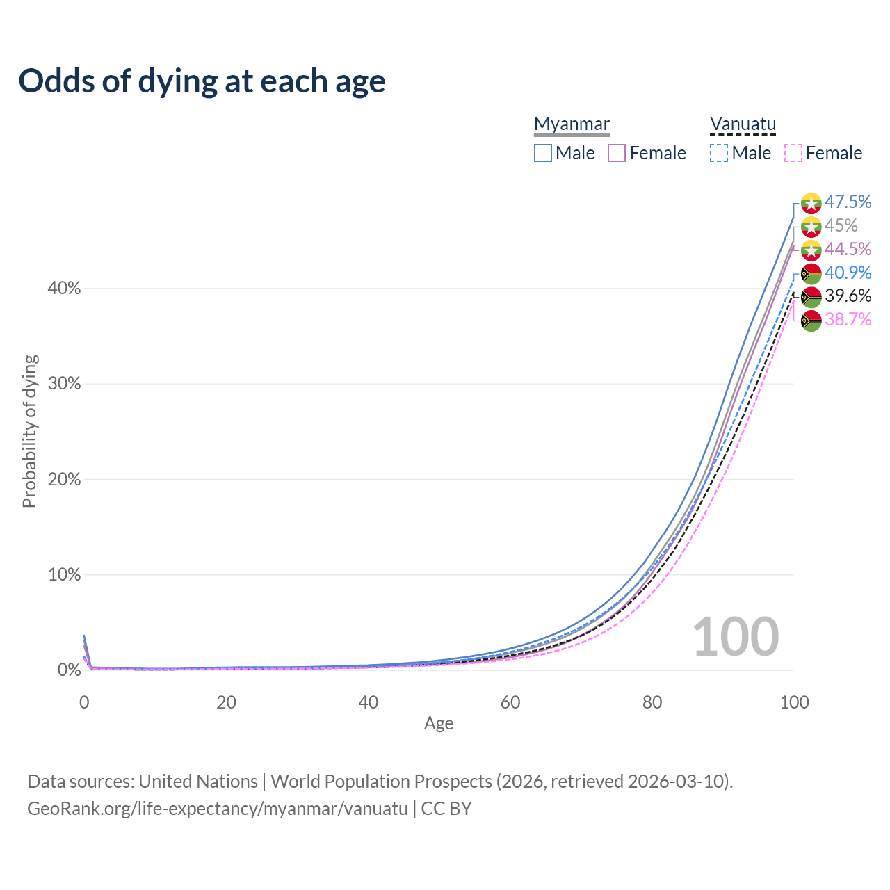 This life expectancy calculator shows the odds of living to 100, 95, 90, and below based on current age for both males and females in Myanmar and Vanuatu, along with mean and median age of death. The calculations are based on the 2026 life tables (actuarial tables) from the UN World Population Prospects.