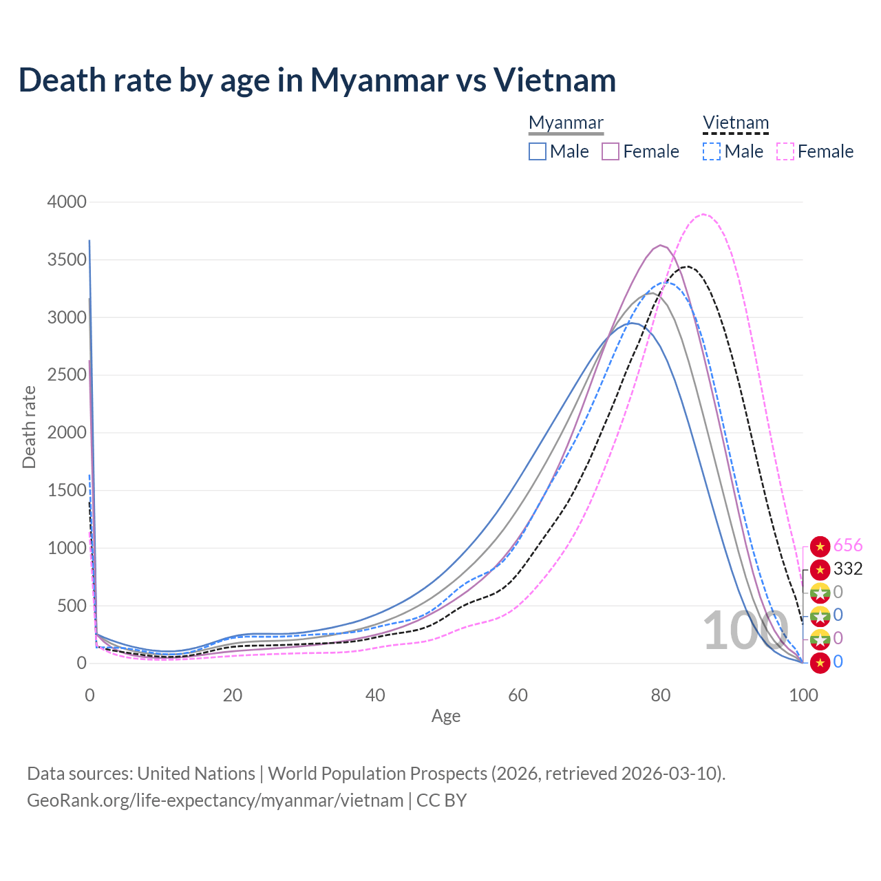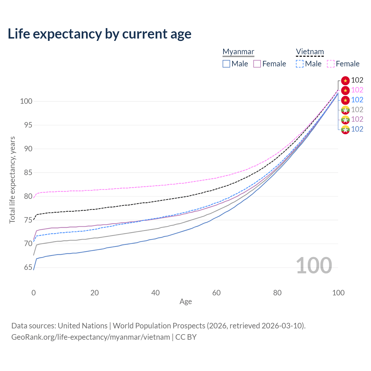 This life expectancy calculator shows the odds of living to 100, 95, 90, and below based on current age for both males and females in Myanmar and Vietnam, along with mean and median age of death. The calculations are based on the 2026 life tables (actuarial tables) from the UN World Population Prospects.