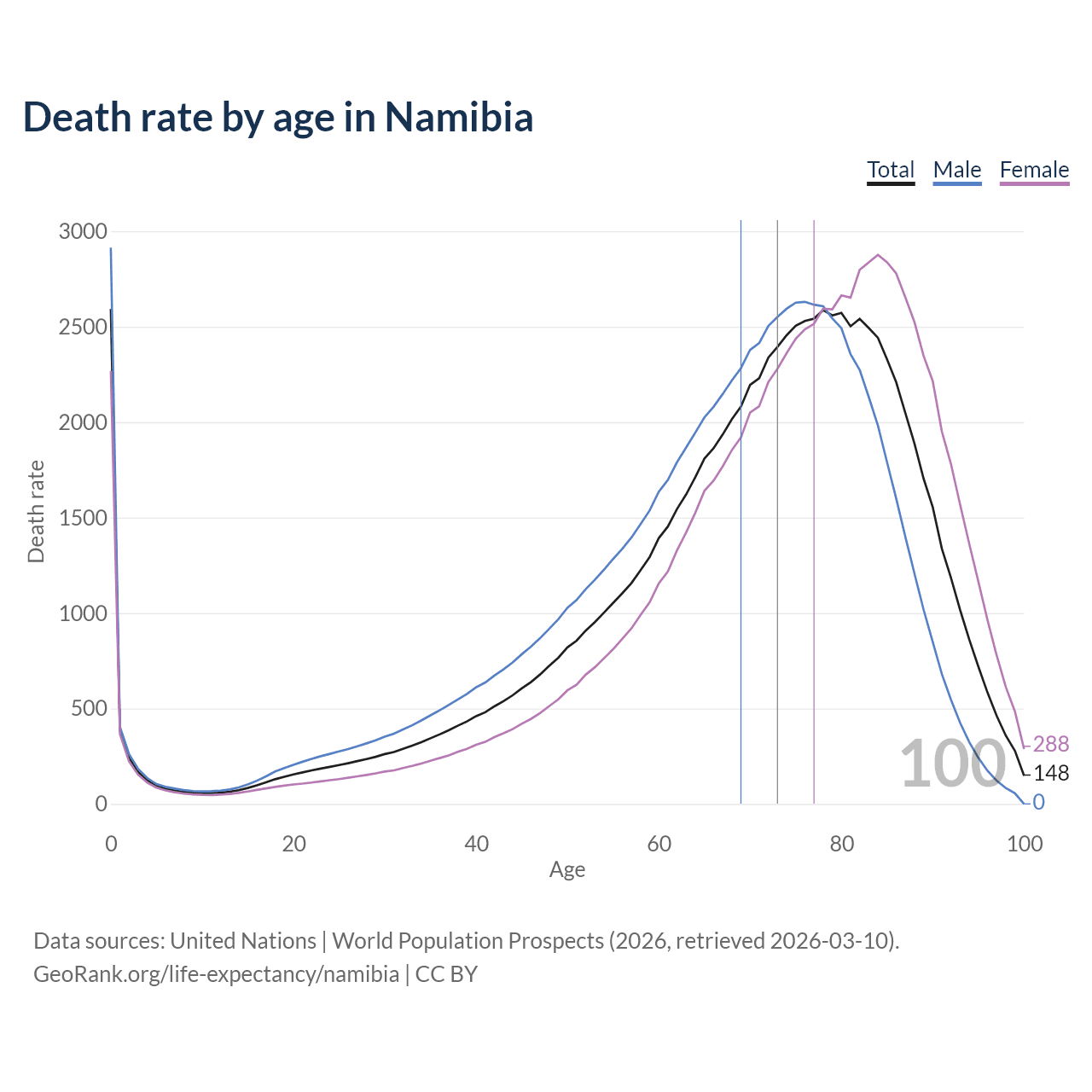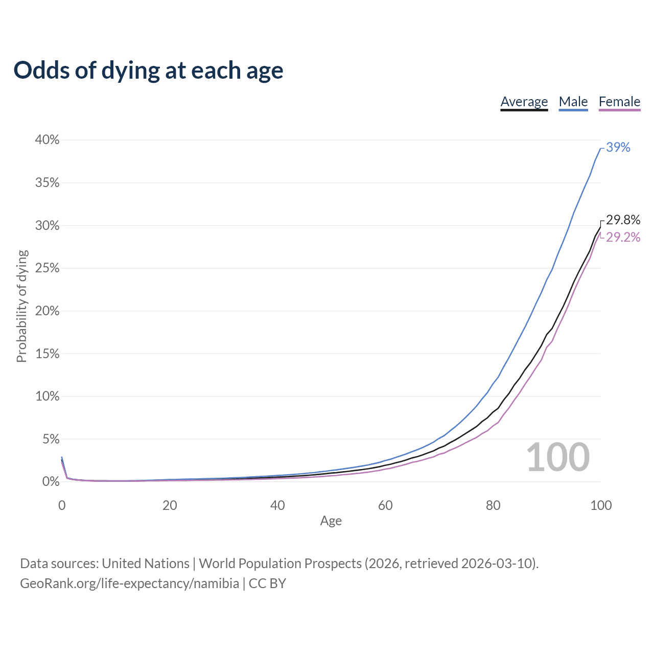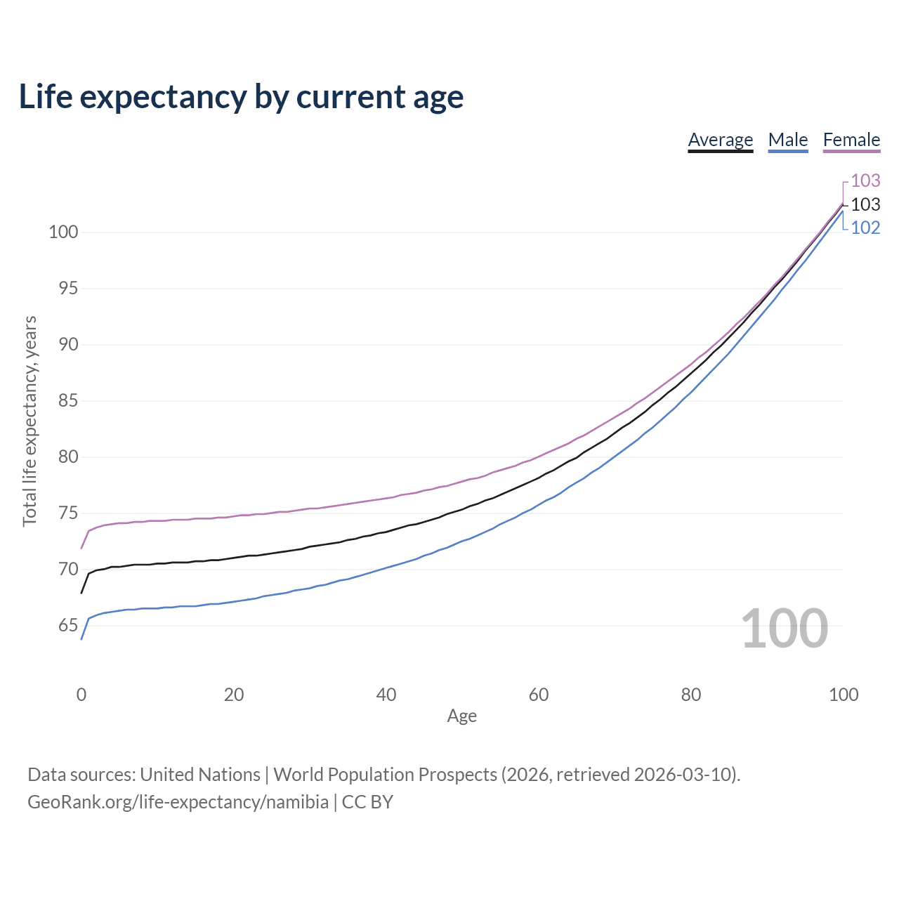 This life expectancy calculator shows the odds of living to 100, 95, 90, and below based on current age for both males and females in Namibia, along with mean and median age of death. The calculations are based on the 2026 life tables (actuarial tables) from the UN World Population Prospects.