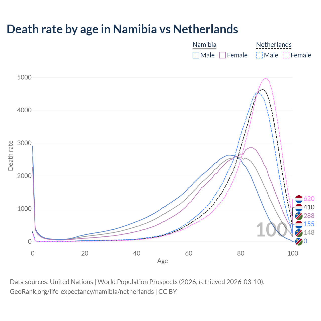 In Namibia, the most common age of death is 0, compared to 88 in the Netherlands. The median age of death is 72.7 in Namibia and 85.5 in the Netherlands, meaning only half of each cohort is expected to live past that age.