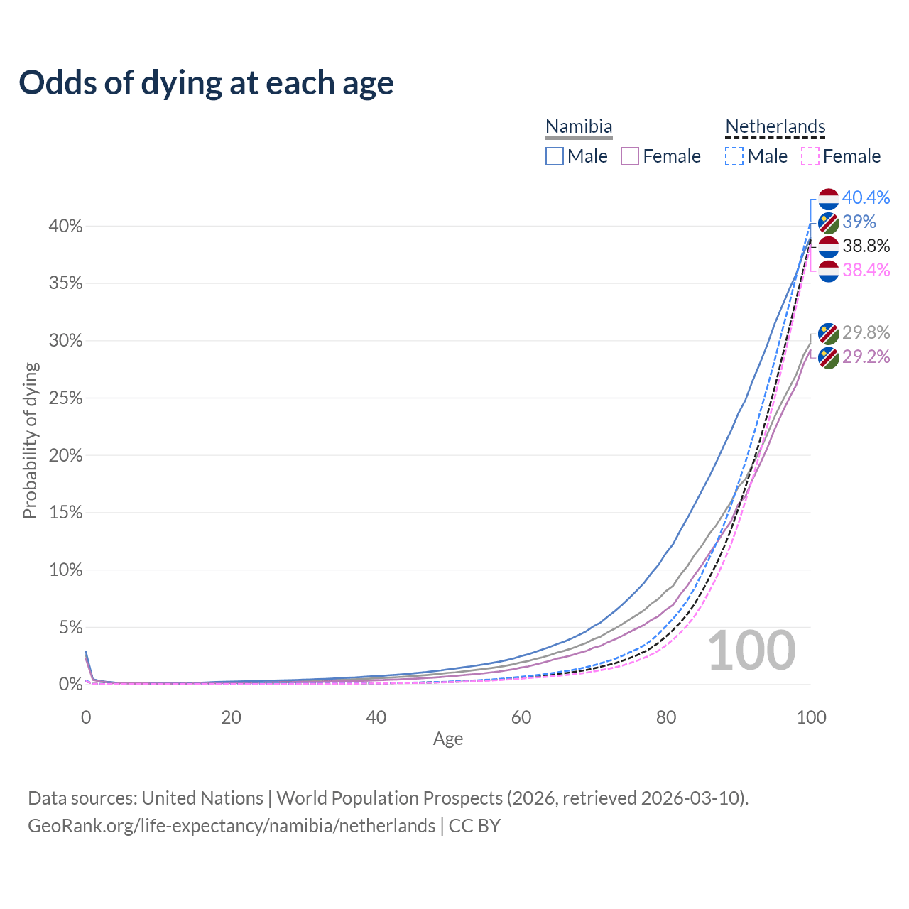 This life expectancy calculator shows the odds of living to 100, 95, 90, and below based on current age for both males and females in Namibia and the Netherlands, along with mean and median age of death. The calculations are based on the 2026 life tables (actuarial tables) from the UN World Population Prospects.