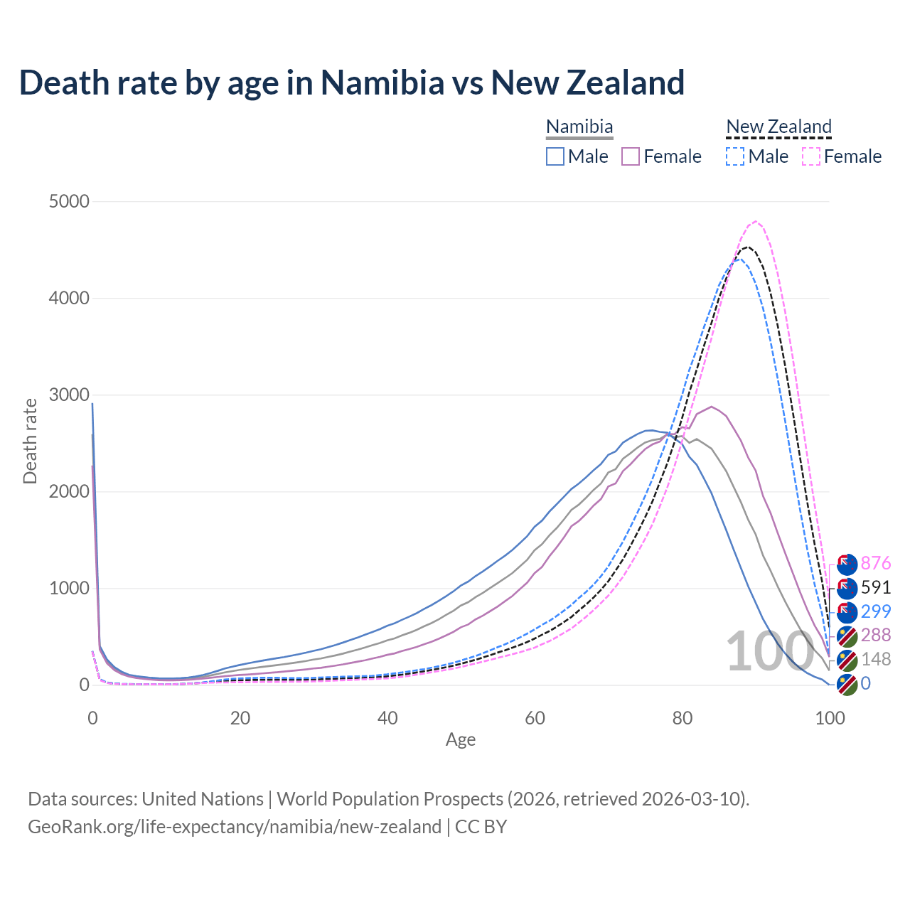 This life expectancy calculator shows the odds of living to 100, 95, 90, and below based on current age for both males and females in Namibia and New Zealand, along with mean and median age of death. The calculations are based on the 2026 life tables (actuarial tables) from the UN World Population Prospects.