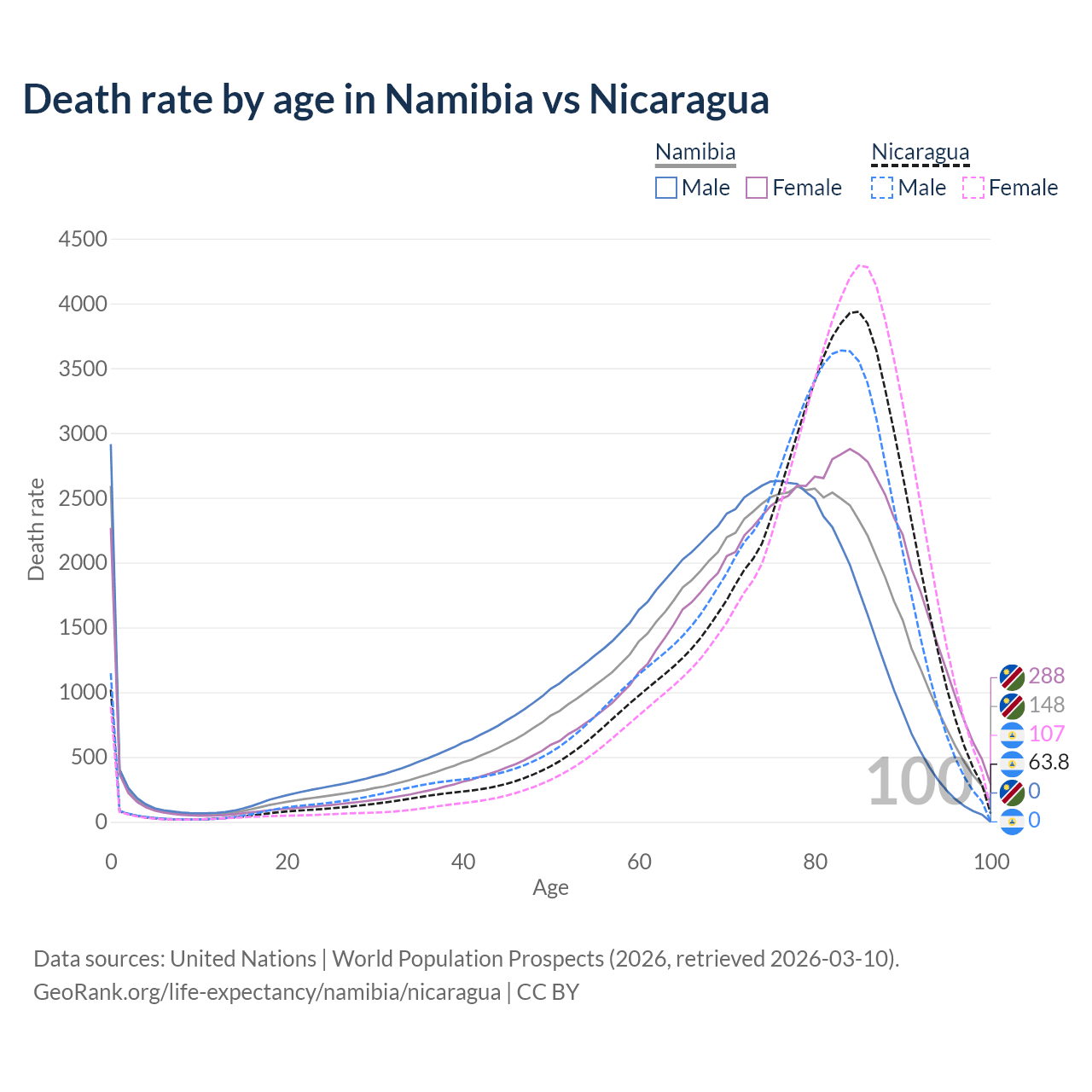 In Namibia, the most common age of death is 0, compared to 85 in Nicaragua. The median age of death is 72.7 in Namibia and 79.9 in Nicaragua, meaning only half of each cohort is expected to live past that age.