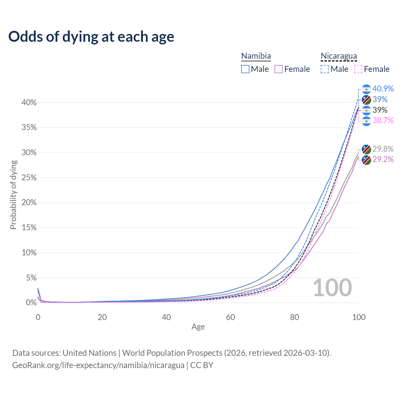 This life expectancy calculator shows the odds of living to 100, 95, 90, and below based on current age for both males and females in Namibia and Nicaragua, along with mean and median age of death. The calculations are based on the 2026 life tables (actuarial tables) from the UN World Population Prospects.
