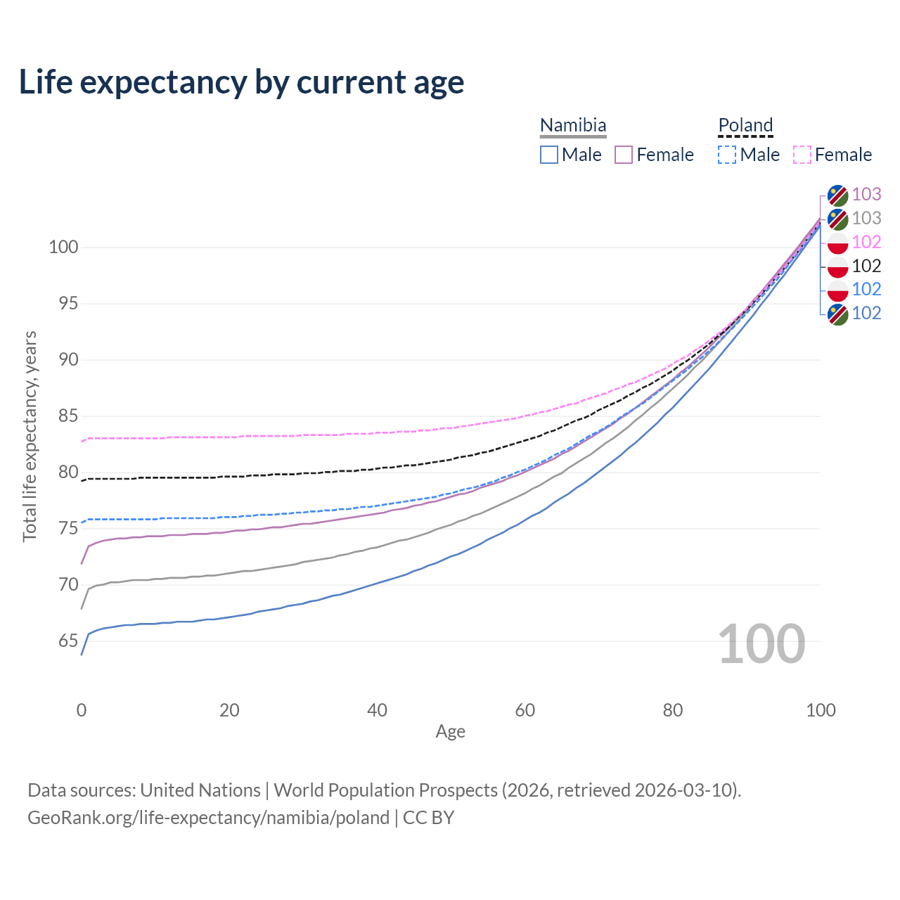 This life expectancy calculator shows the odds of living to 100, 95, 90, and below based on current age for both males and females in Namibia and Poland, along with mean and median age of death. The calculations are based on the 2026 life tables (actuarial tables) from the UN World Population Prospects.