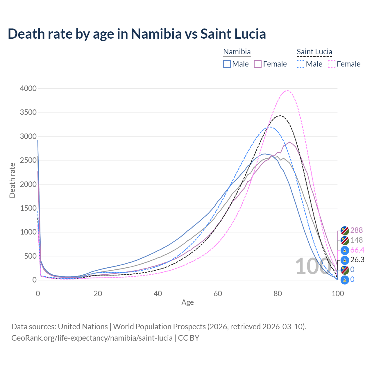 In Namibia, the most common age of death is 0, compared to 81 in Saint Lucia. The median age of death is 72.7 in Namibia and 76.8 in Saint Lucia, meaning only half of each cohort is expected to live past that age.