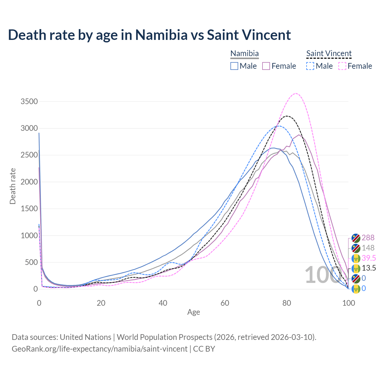 In Namibia, the most common age of death is 0, compared to 80 in Saint Vincent. The median age of death is 72.7 in Namibia and 75.6 in Saint Vincent, meaning only half of each cohort is expected to live past that age.