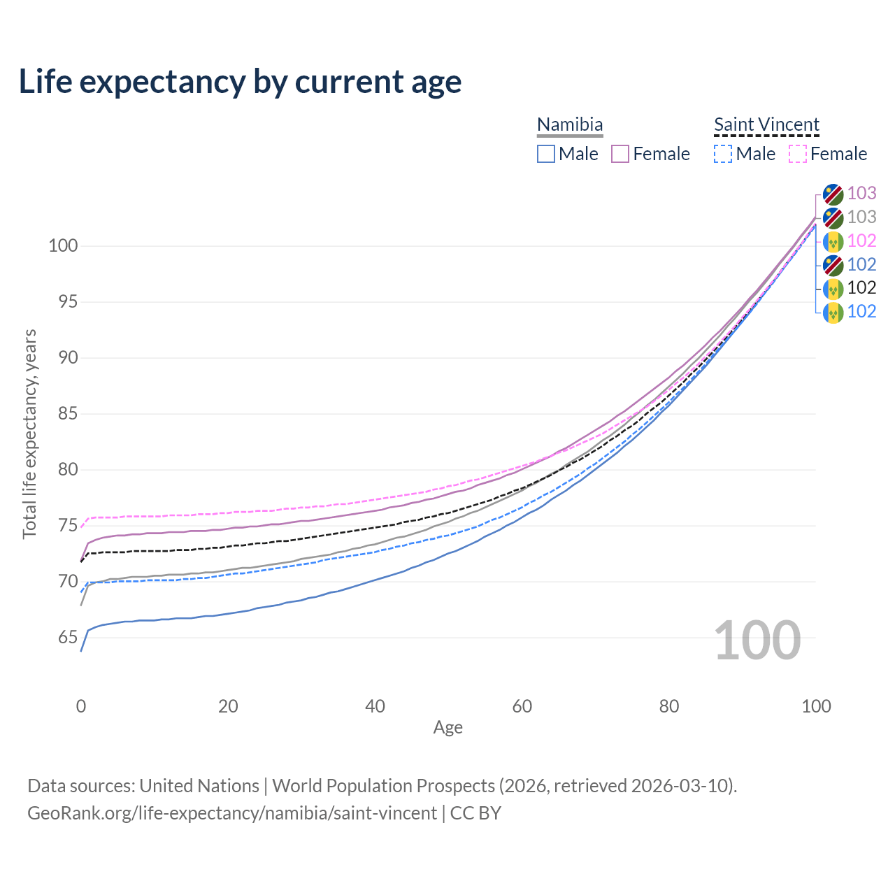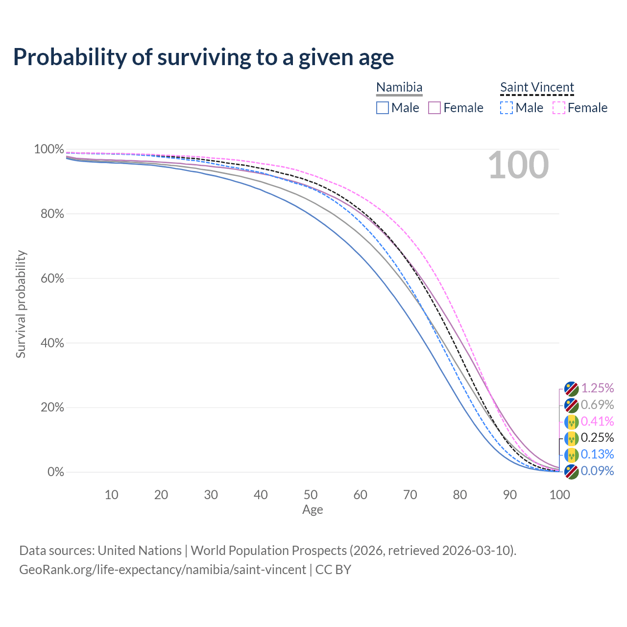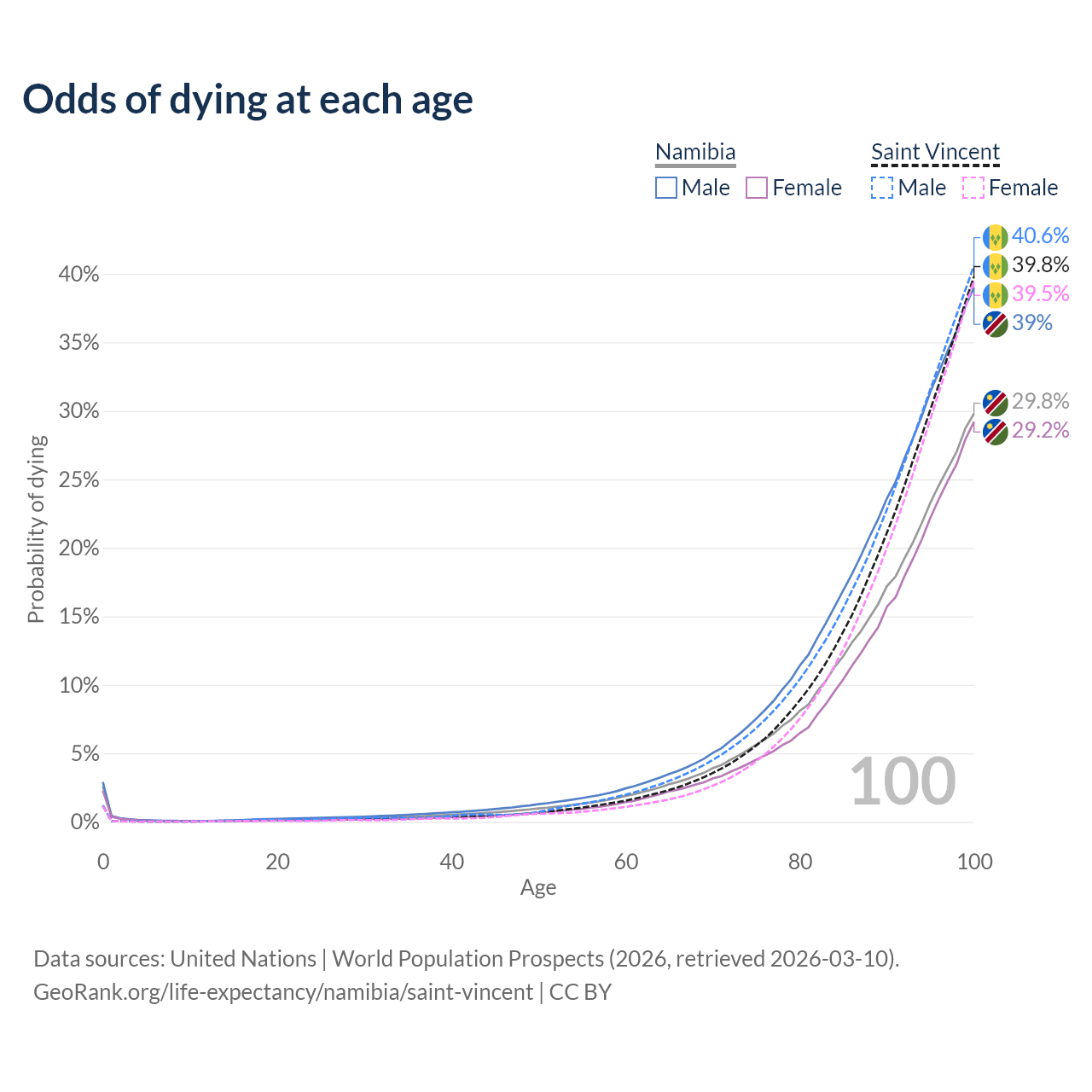 This life expectancy calculator shows the odds of living to 100, 95, 90, and below based on current age for both males and females in Namibia and Saint Vincent, along with mean and median age of death. The calculations are based on the 2026 life tables (actuarial tables) from the UN World Population Prospects.