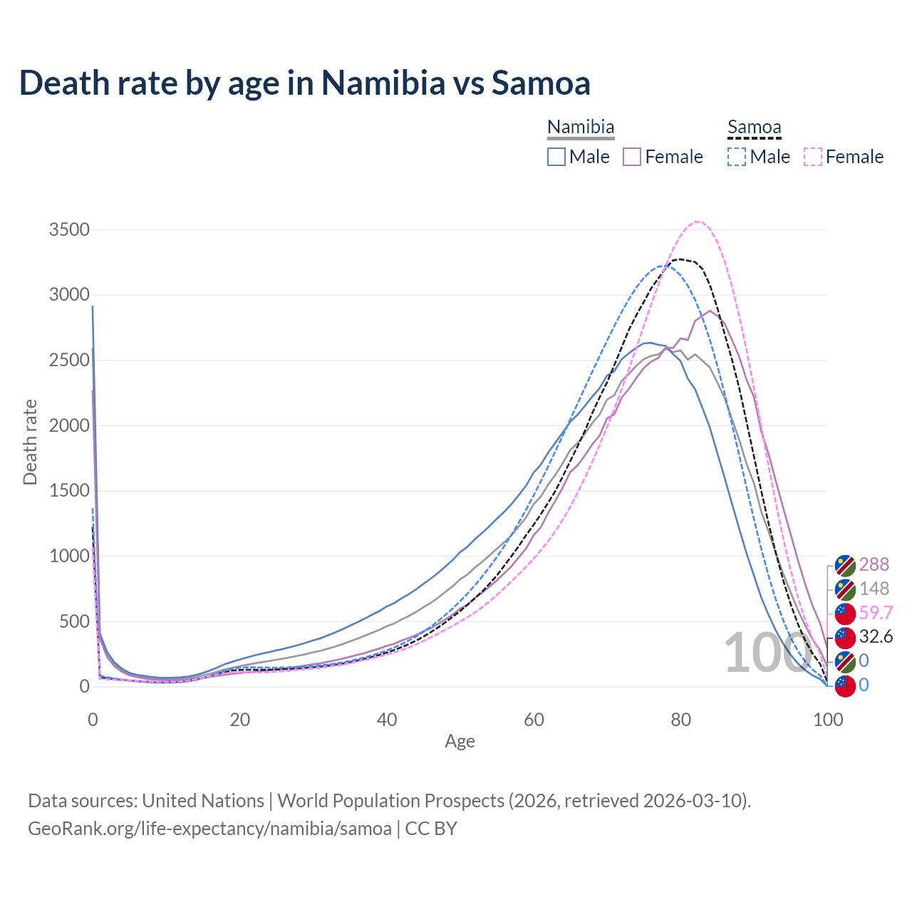 In Namibia, the most common age of death is 0, compared to 80 in Samoa. The median age of death is 72.7 in Namibia and 75.9 in Samoa, meaning only half of each cohort is expected to live past that age.
