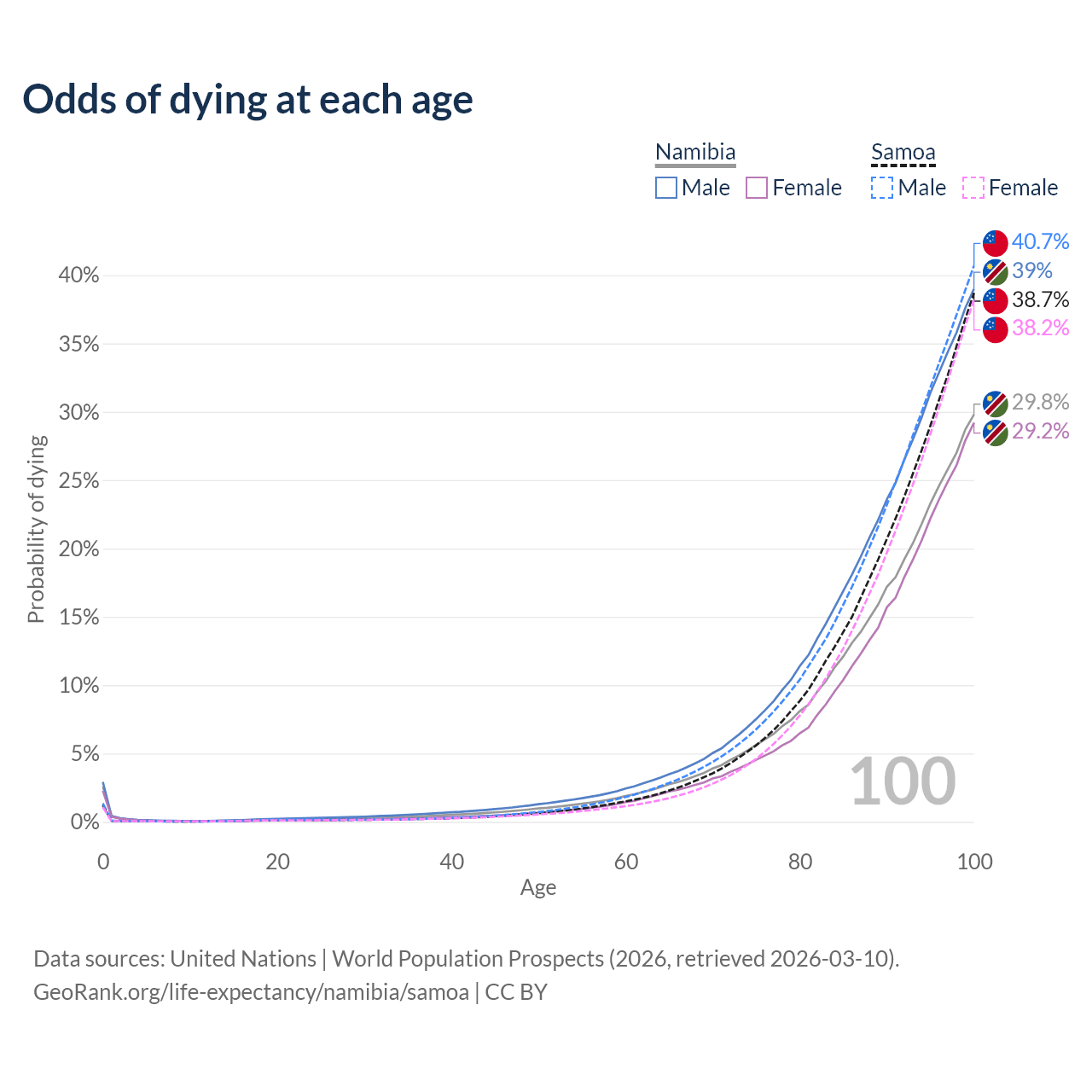 This life expectancy calculator shows the odds of living to 100, 95, 90, and below based on current age for both males and females in Namibia and Samoa, along with mean and median age of death. The calculations are based on the 2026 life tables (actuarial tables) from the UN World Population Prospects.