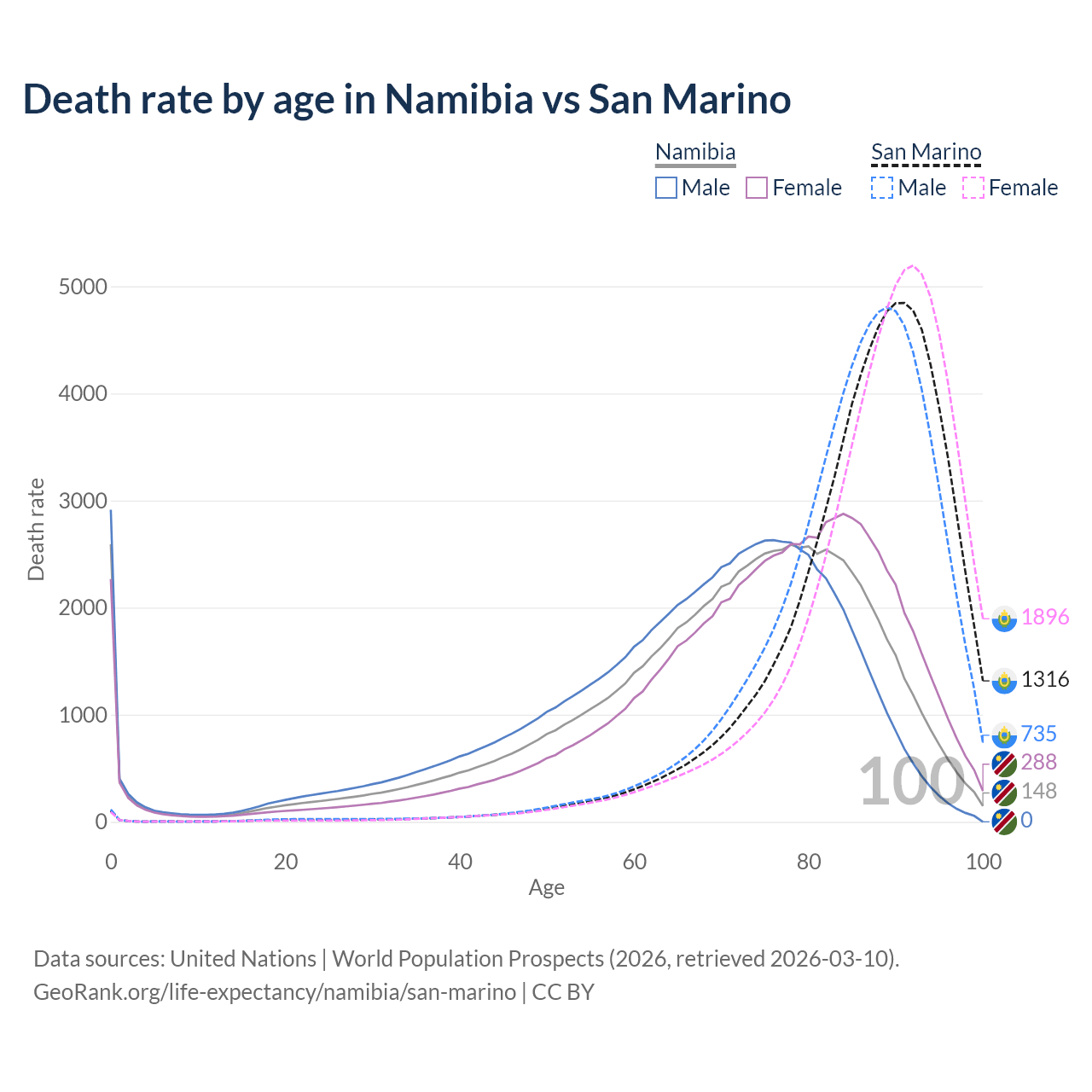 In Namibia, the most common age of death is 0, compared to 91 in San Marino. The median age of death is 72.7 in Namibia and 88.3 in San Marino, meaning only half of each cohort is expected to live past that age.