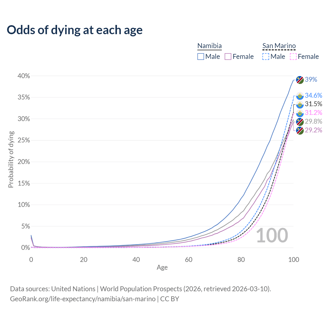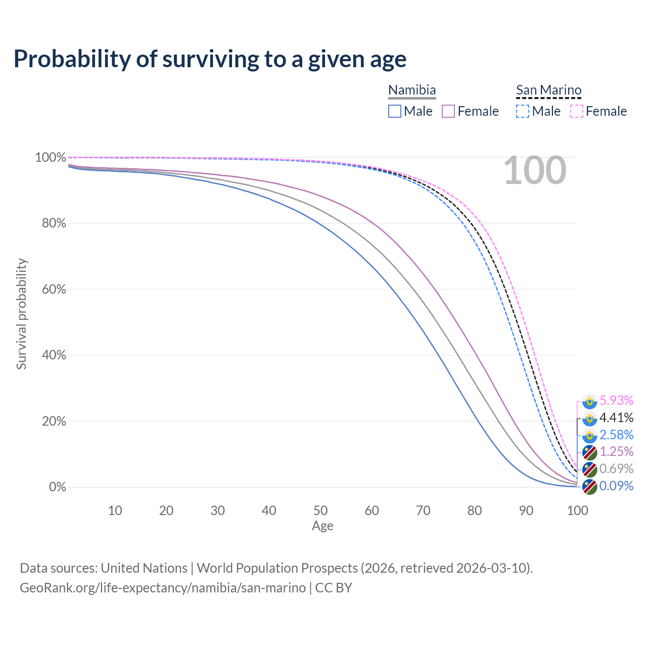 This life expectancy calculator shows the odds of living to 100, 95, 90, and below based on current age for both males and females in Namibia and San Marino, along with mean and median age of death. The calculations are based on the 2026 life tables (actuarial tables) from the UN World Population Prospects.