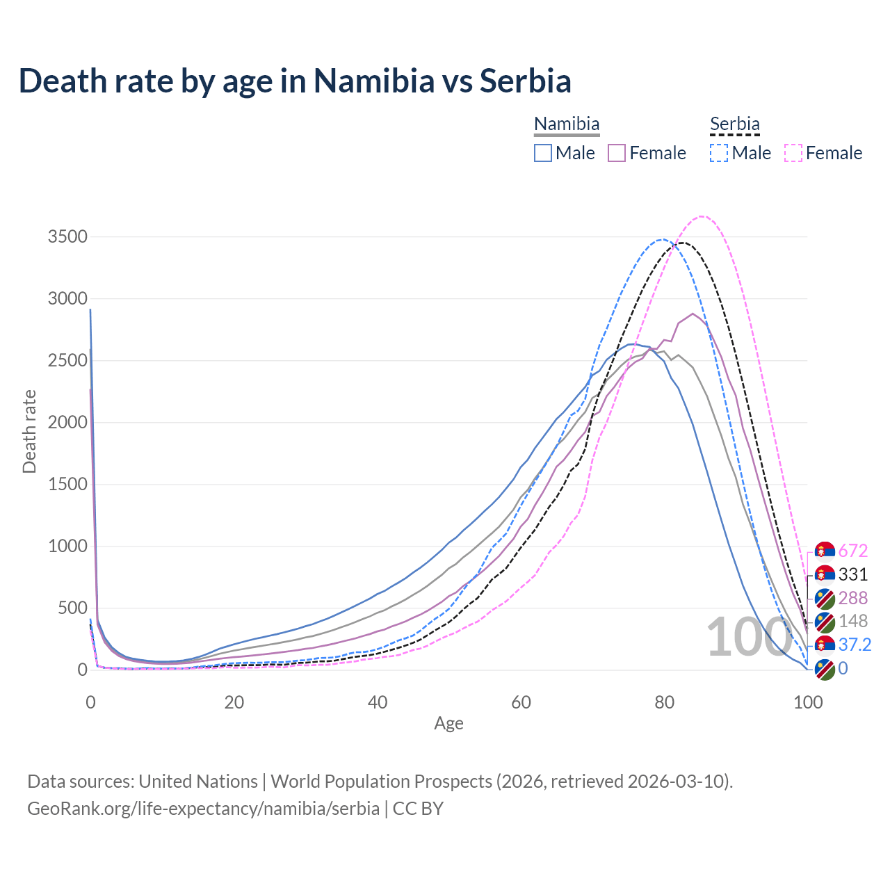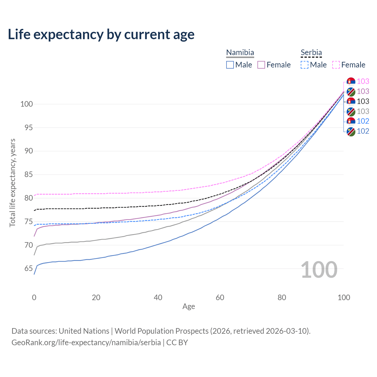 This life expectancy calculator shows the odds of living to 100, 95, 90, and below based on current age for both males and females in Namibia and Serbia, along with mean and median age of death. The calculations are based on the 2026 life tables (actuarial tables) from the UN World Population Prospects.