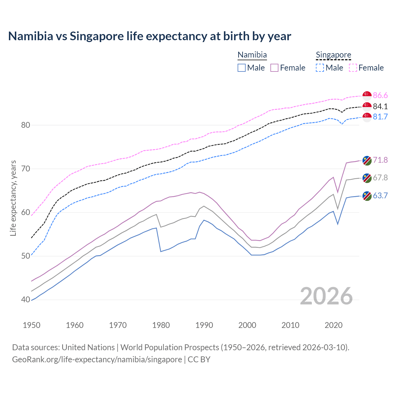 The average life expectancy at birth is 67.8 years in Namibia vs 84.1 in Singapore. Namibia is ranked 153/197 by life expectancy, and Singapore is 9/197. In Namibia, the life expectancy is 63.7 years for males and 71.8 years for females. In Singapore, it's 81.7 years for males and 86.6 years for females.