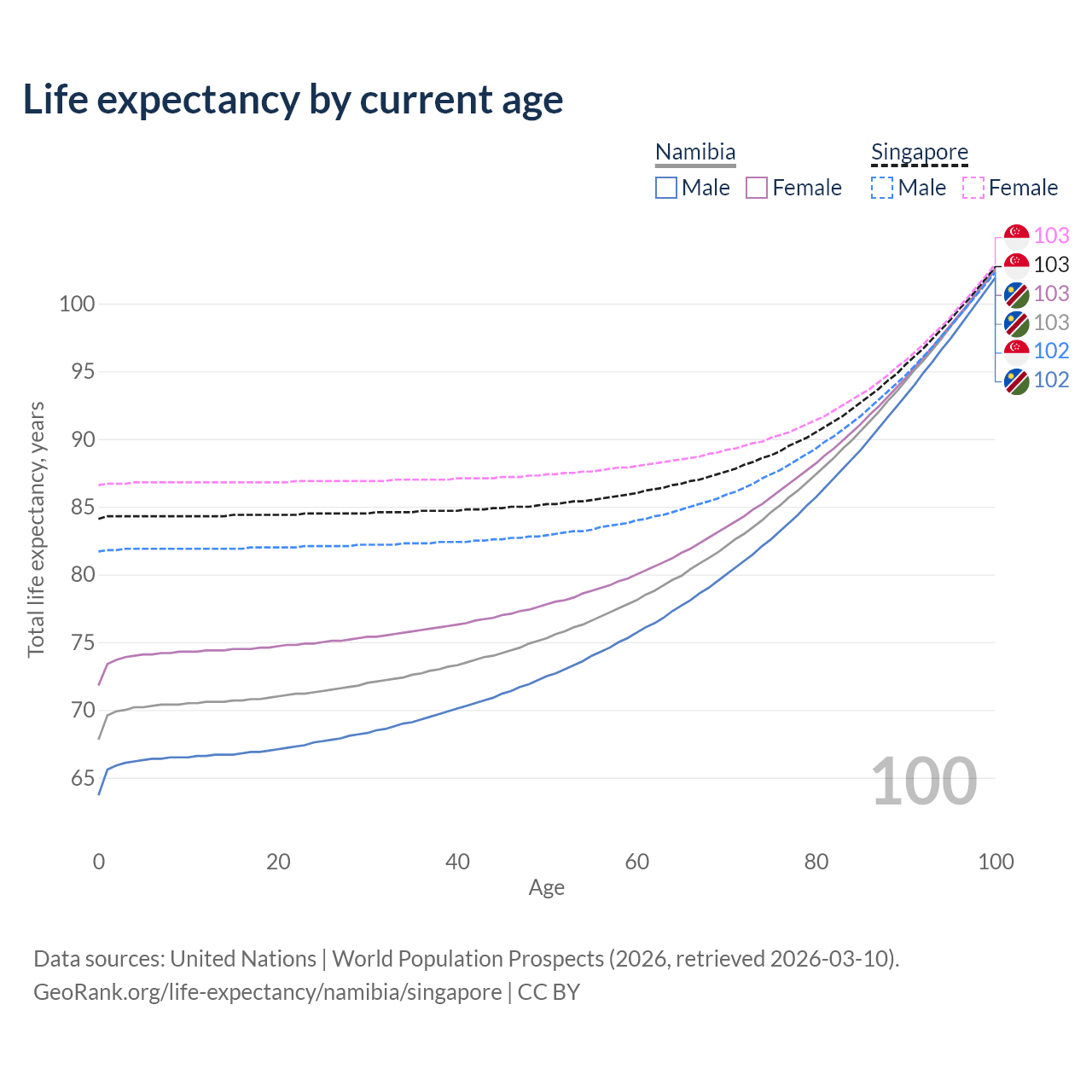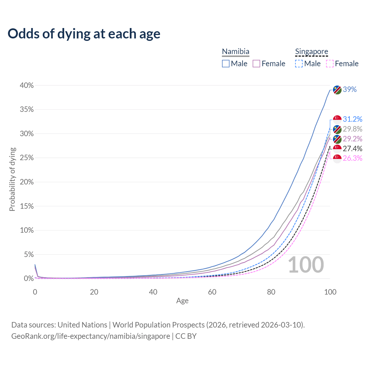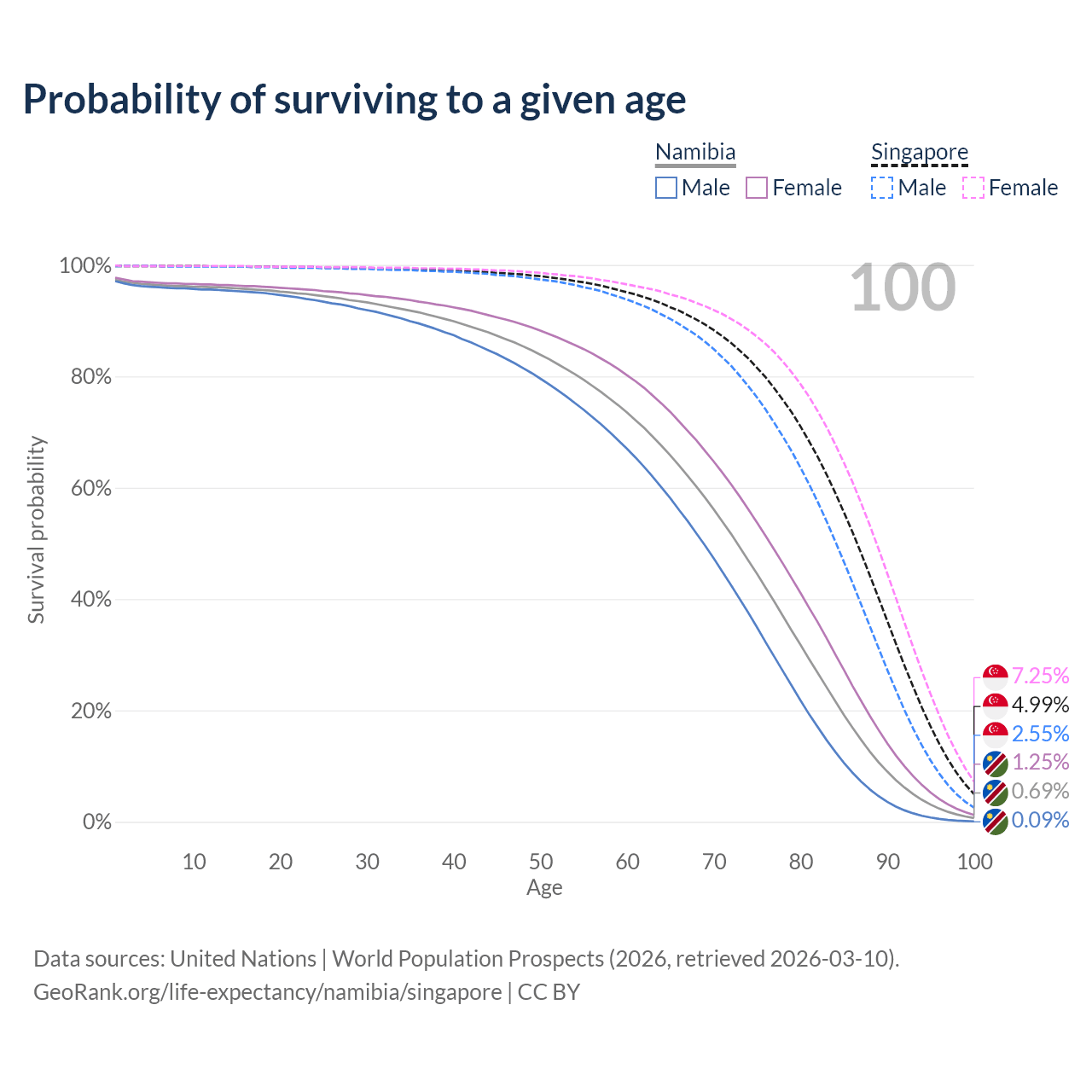 This life expectancy calculator shows the odds of living to 100, 95, 90, and below based on current age for both males and females in Namibia and Singapore, along with mean and median age of death. The calculations are based on the 2026 life tables (actuarial tables) from the UN World Population Prospects.
