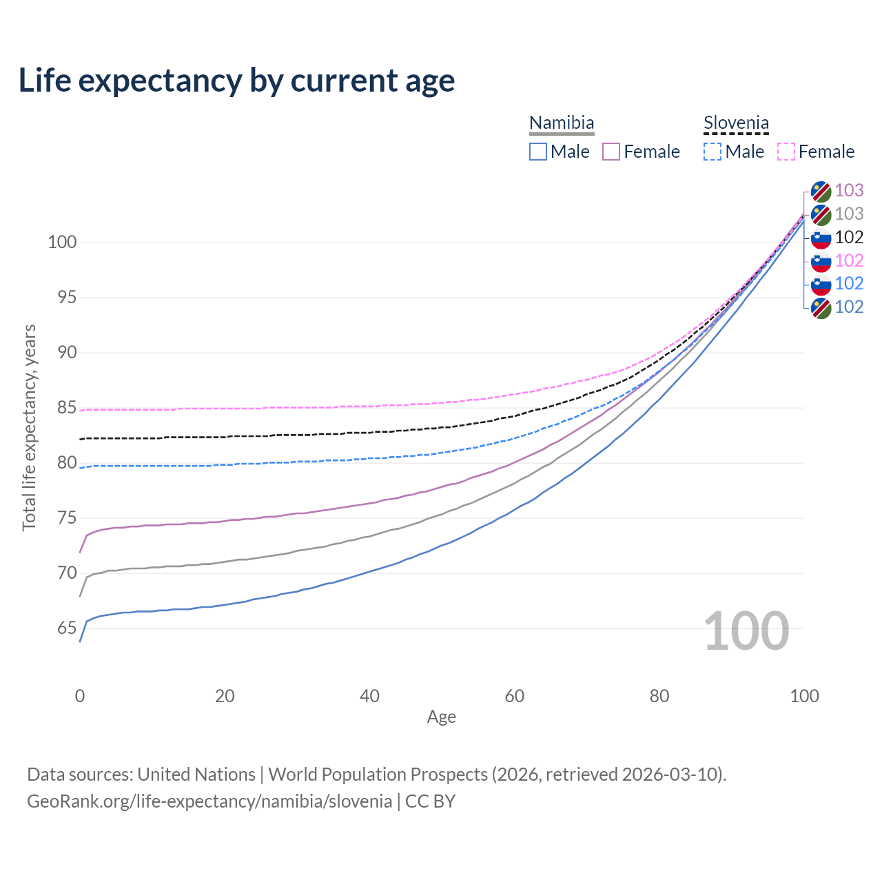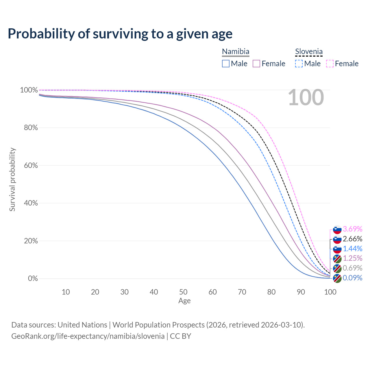 This life expectancy calculator shows the odds of living to 100, 95, 90, and below based on current age for both males and females in Namibia and Slovenia, along with mean and median age of death. The calculations are based on the 2026 life tables (actuarial tables) from the UN World Population Prospects.