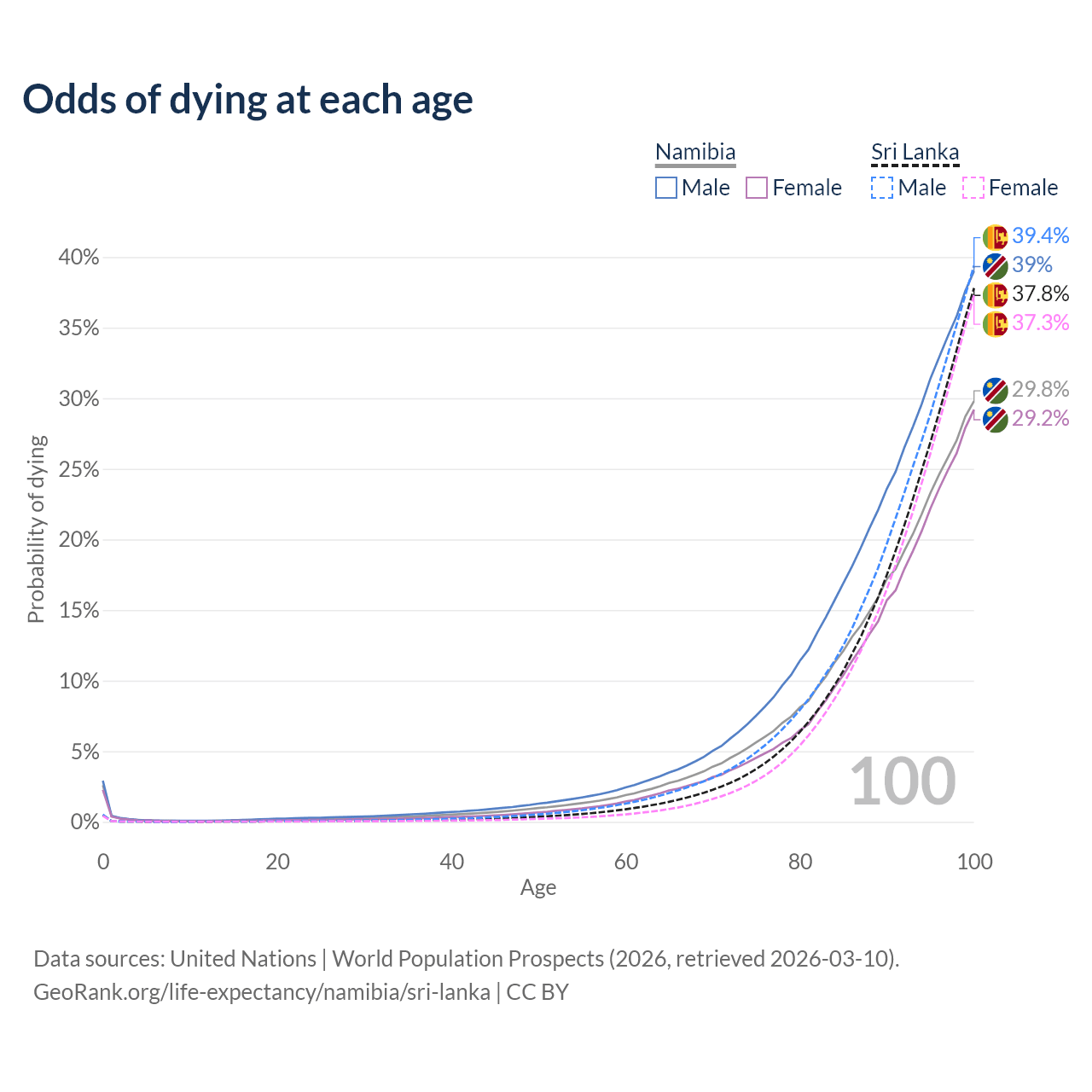 This life expectancy calculator shows the odds of living to 100, 95, 90, and below based on current age for both males and females in Namibia and Sri Lanka, along with mean and median age of death. The calculations are based on the 2026 life tables (actuarial tables) from the UN World Population Prospects.