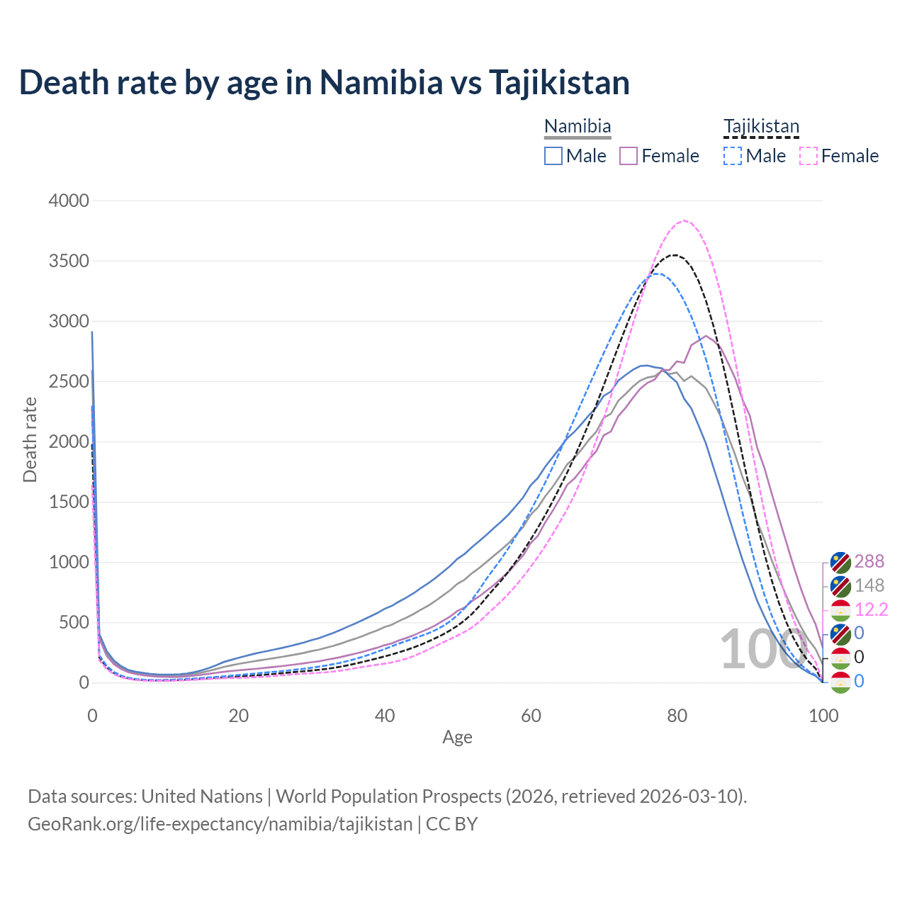 In Namibia, the most common age of death is 0, compared to 80 in Tajikistan. The median age of death is 72.7 in Namibia and 76 in Tajikistan, meaning only half of each cohort is expected to live past that age.