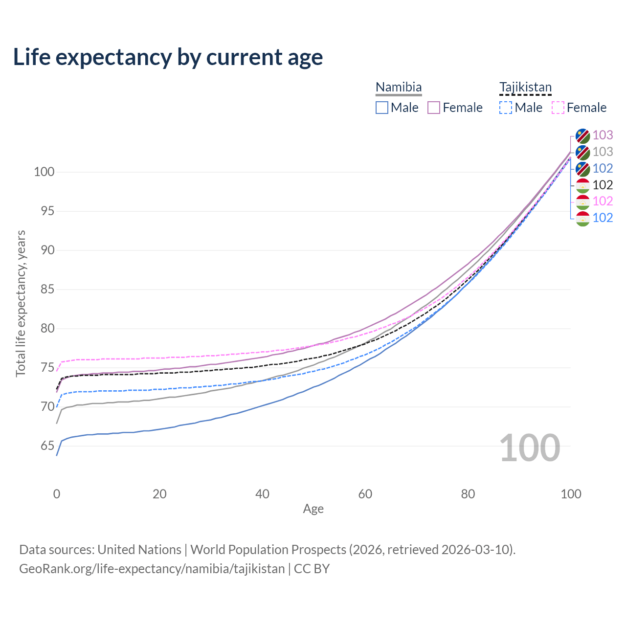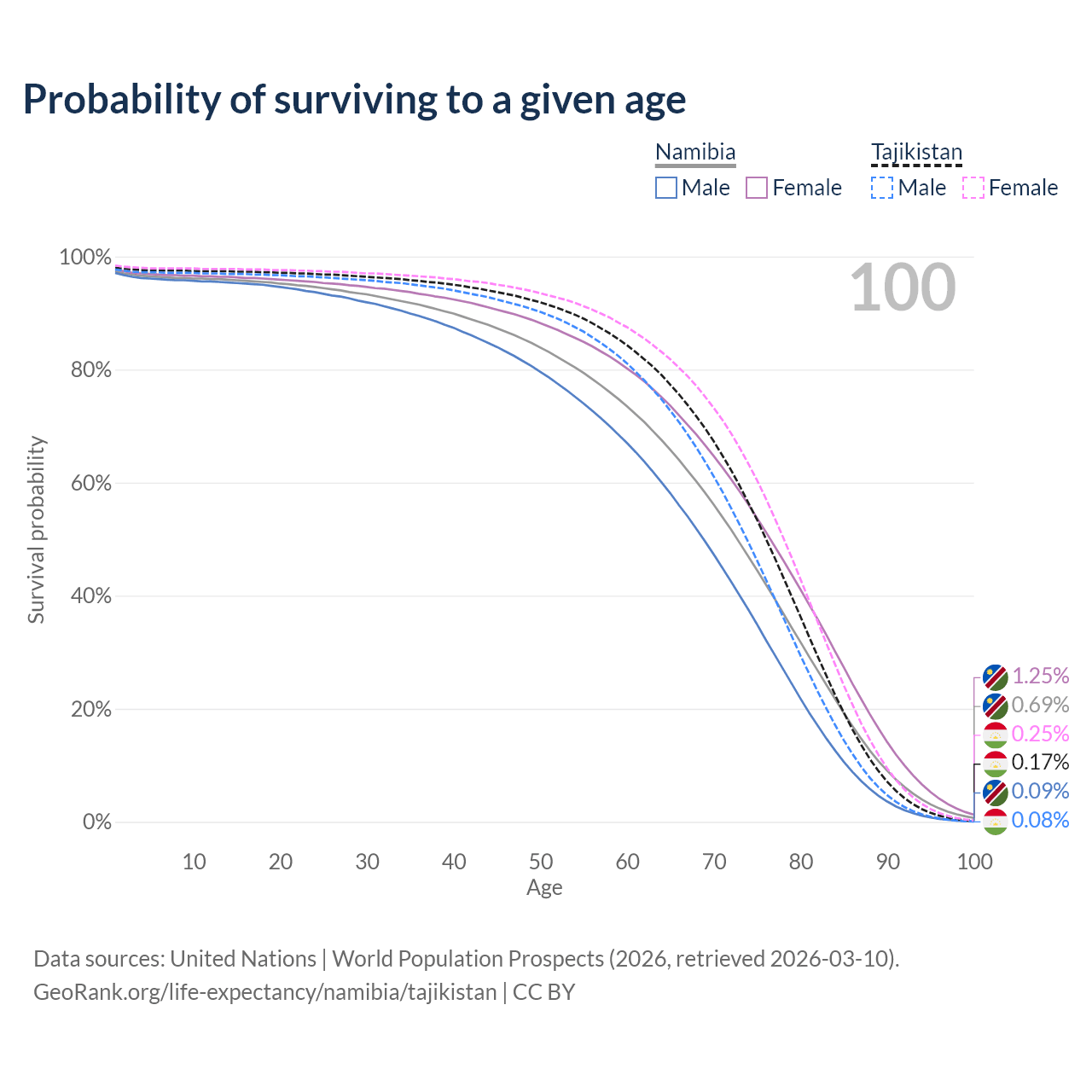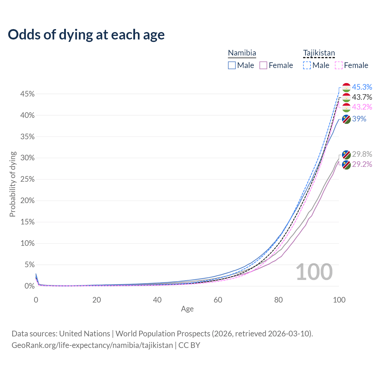 This life expectancy calculator shows the odds of living to 100, 95, 90, and below based on current age for both males and females in Namibia and Tajikistan, along with mean and median age of death. The calculations are based on the 2026 life tables (actuarial tables) from the UN World Population Prospects.