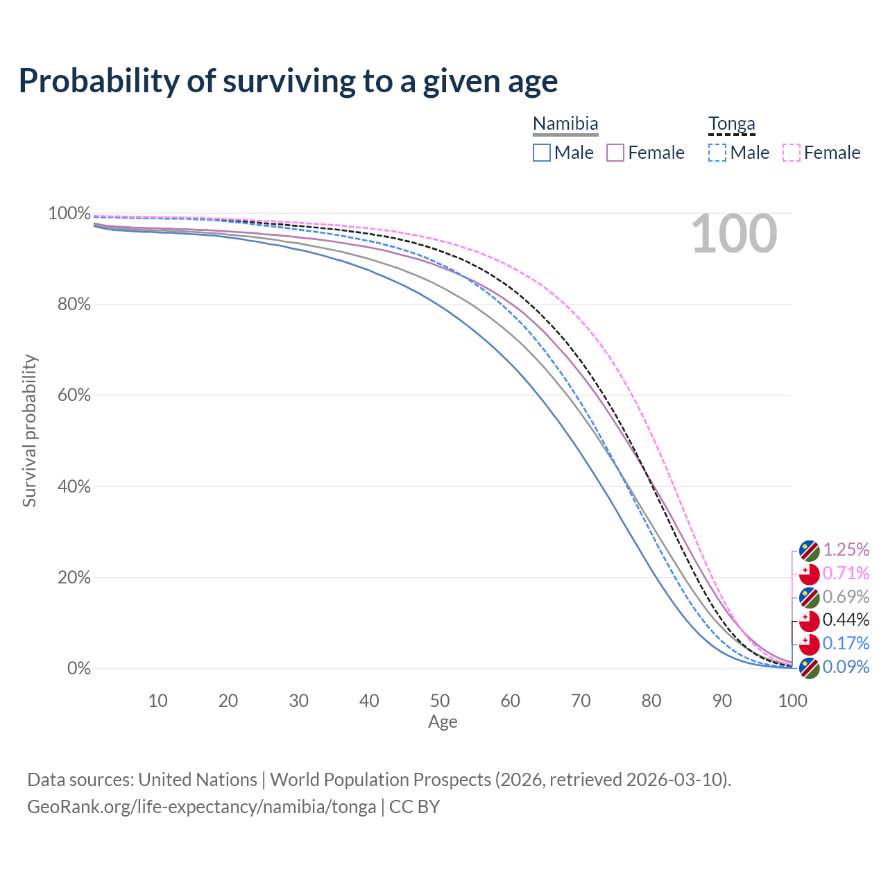 This life expectancy calculator shows the odds of living to 100, 95, 90, and below based on current age for both males and females in Namibia and Tonga, along with mean and median age of death. The calculations are based on the 2026 life tables (actuarial tables) from the UN World Population Prospects.