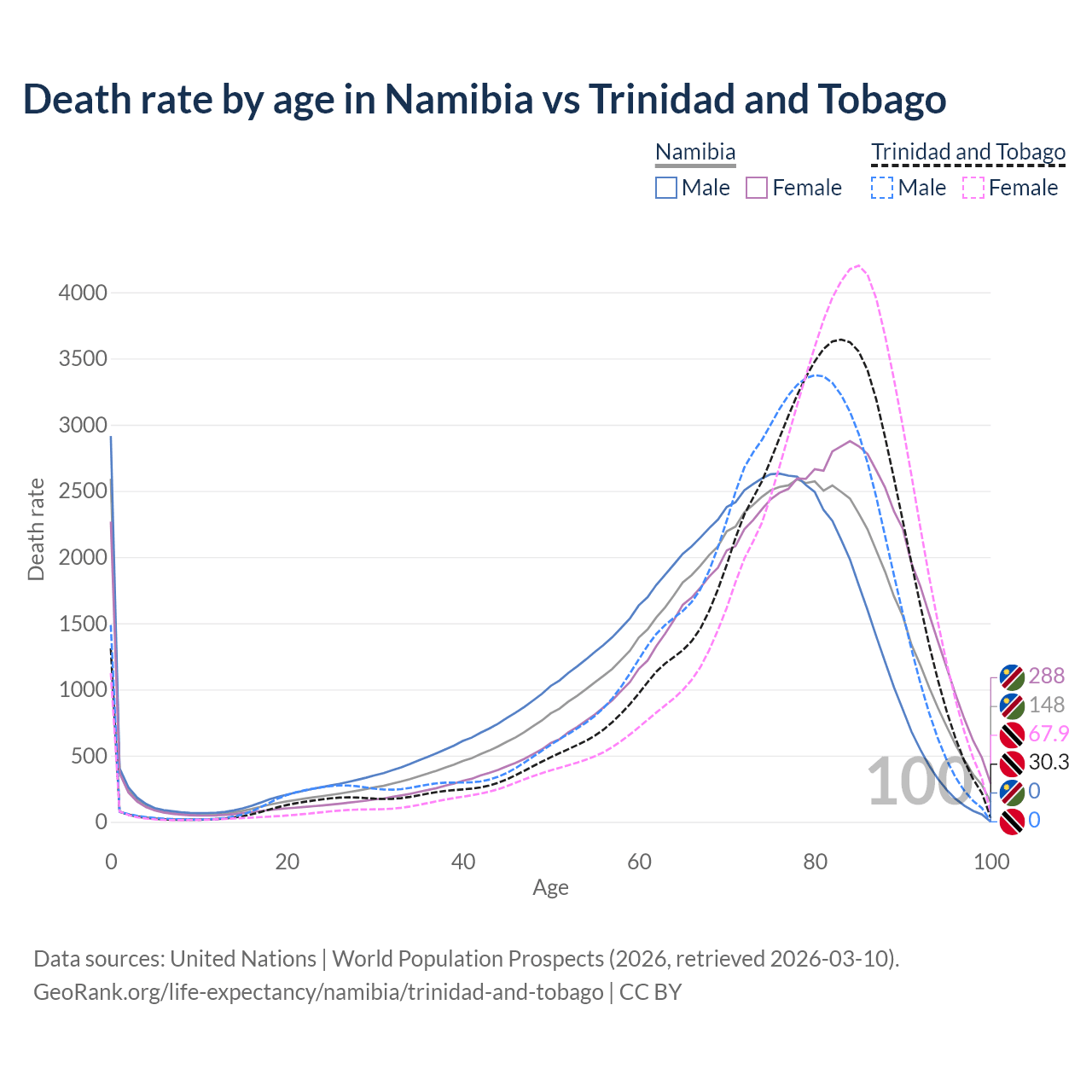 In Namibia, the most common age of death is 0, compared to 83 in Trinidad and Tobago. The median age of death is 72.7 in Namibia and 78.4 in Trinidad and Tobago, meaning only half of each cohort is expected to live past that age.