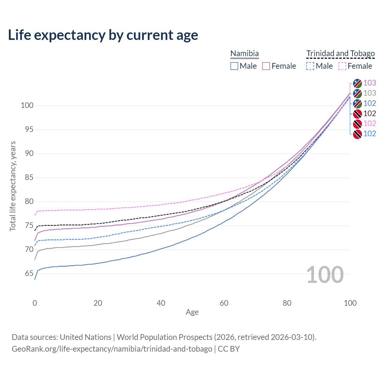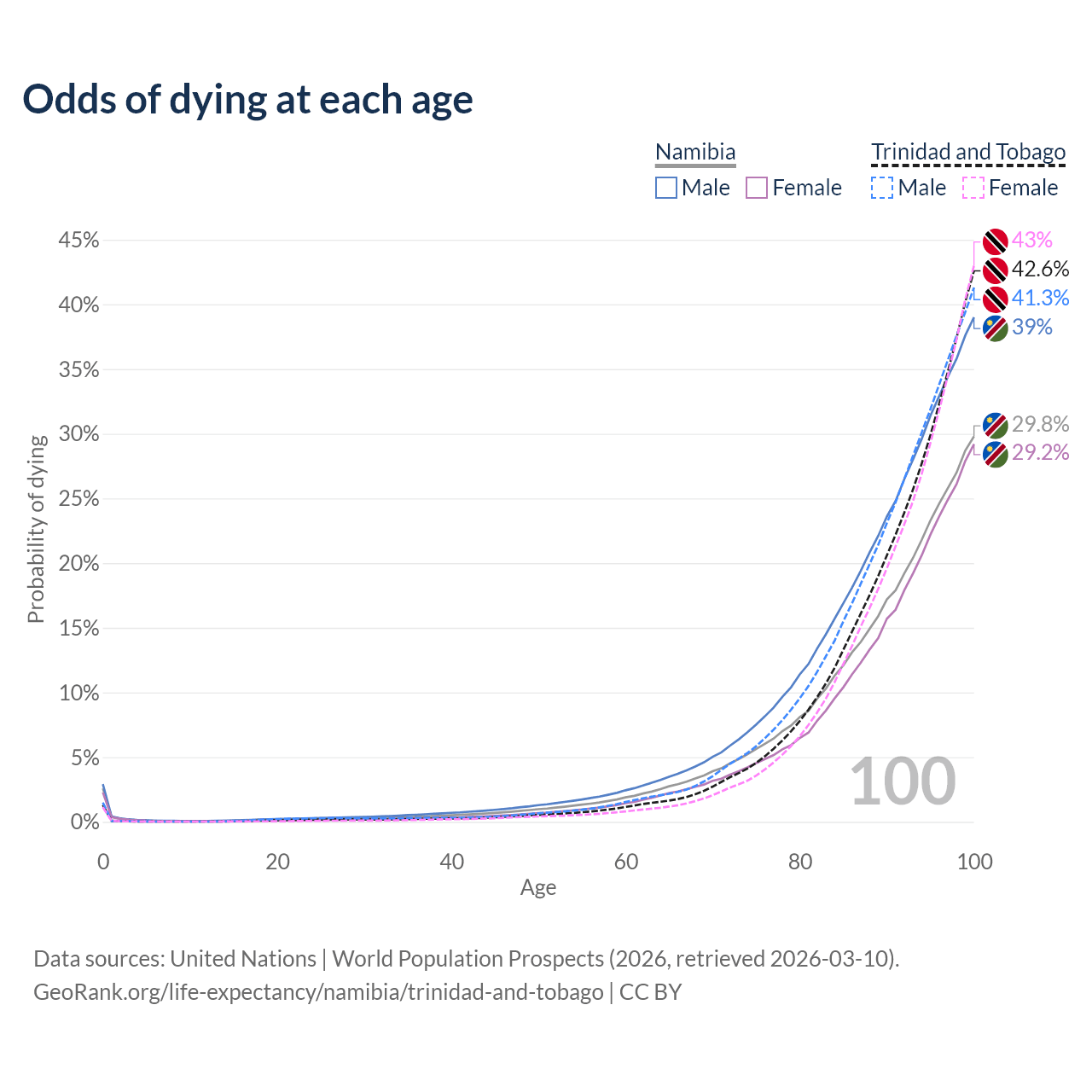 This life expectancy calculator shows the odds of living to 100, 95, 90, and below based on current age for both males and females in Namibia and Trinidad and Tobago, along with mean and median age of death. The calculations are based on the 2026 life tables (actuarial tables) from the UN World Population Prospects.