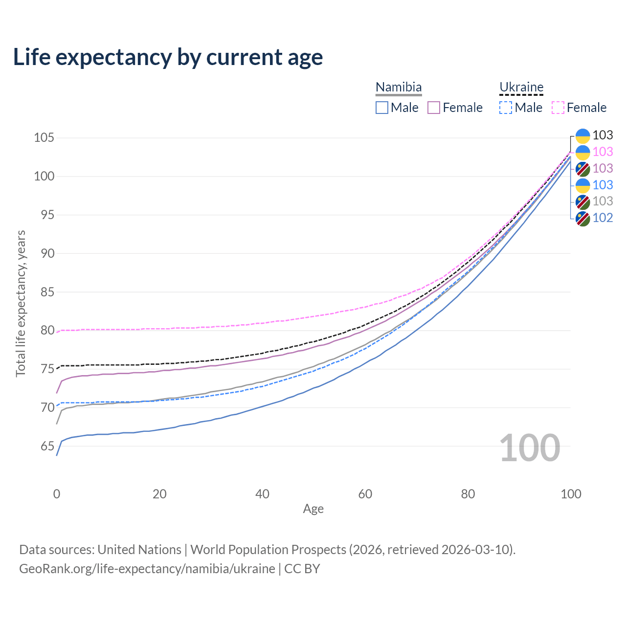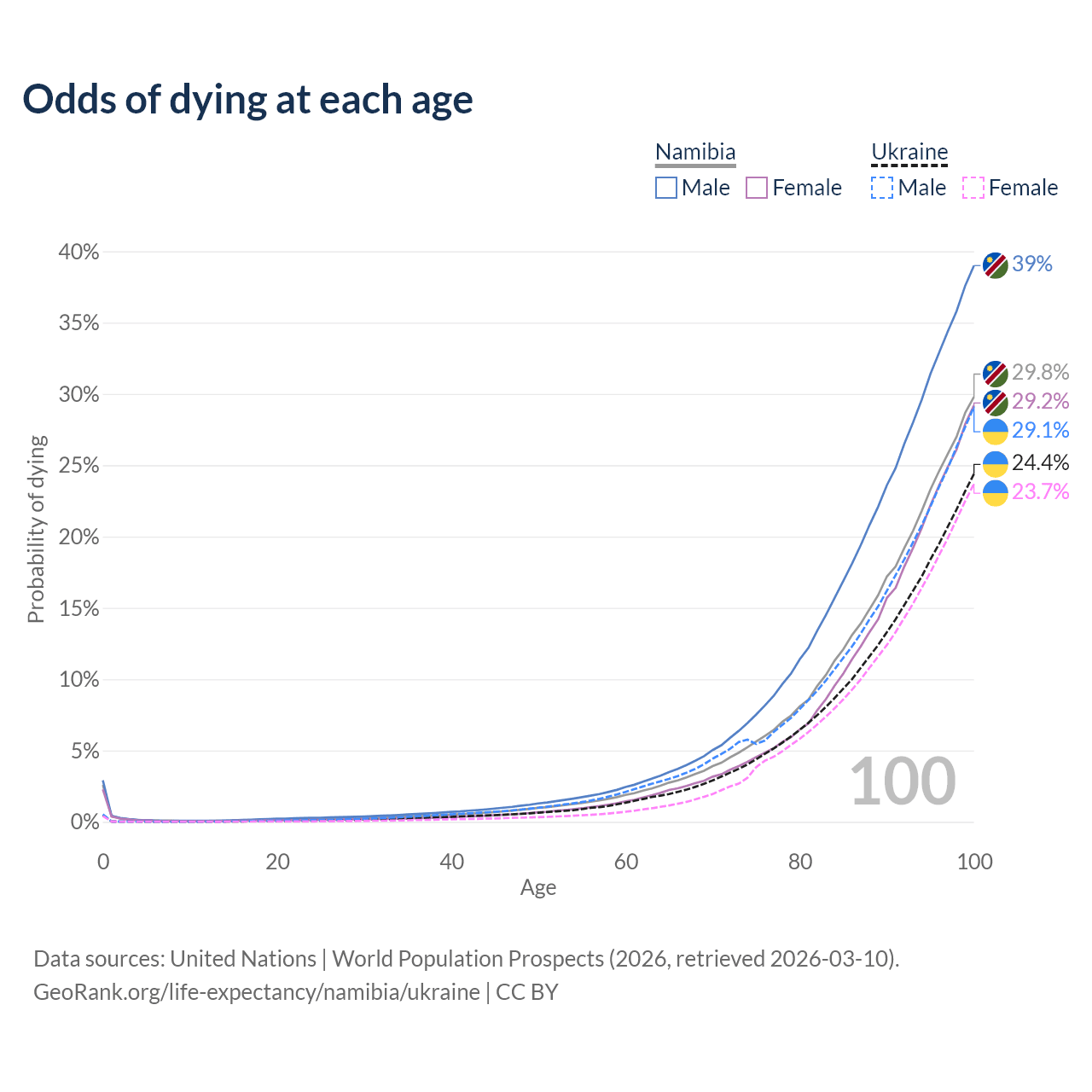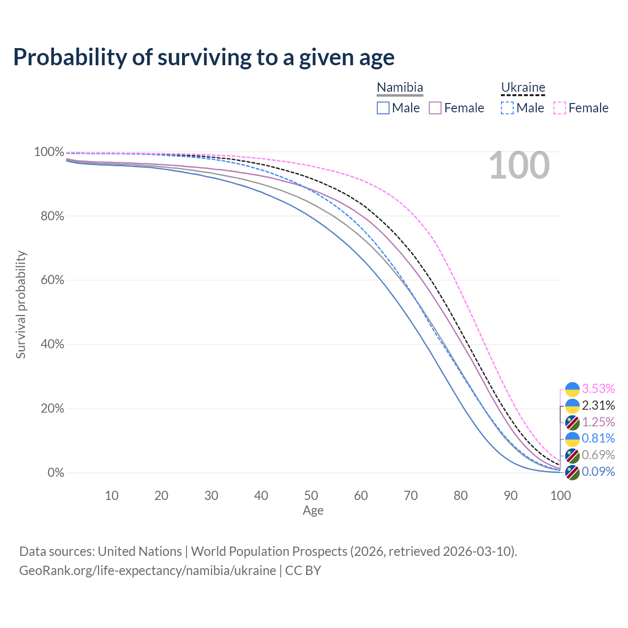 This life expectancy calculator shows the odds of living to 100, 95, 90, and below based on current age for both males and females in Namibia and Ukraine, along with mean and median age of death. The calculations are based on the 2026 life tables (actuarial tables) from the UN World Population Prospects.