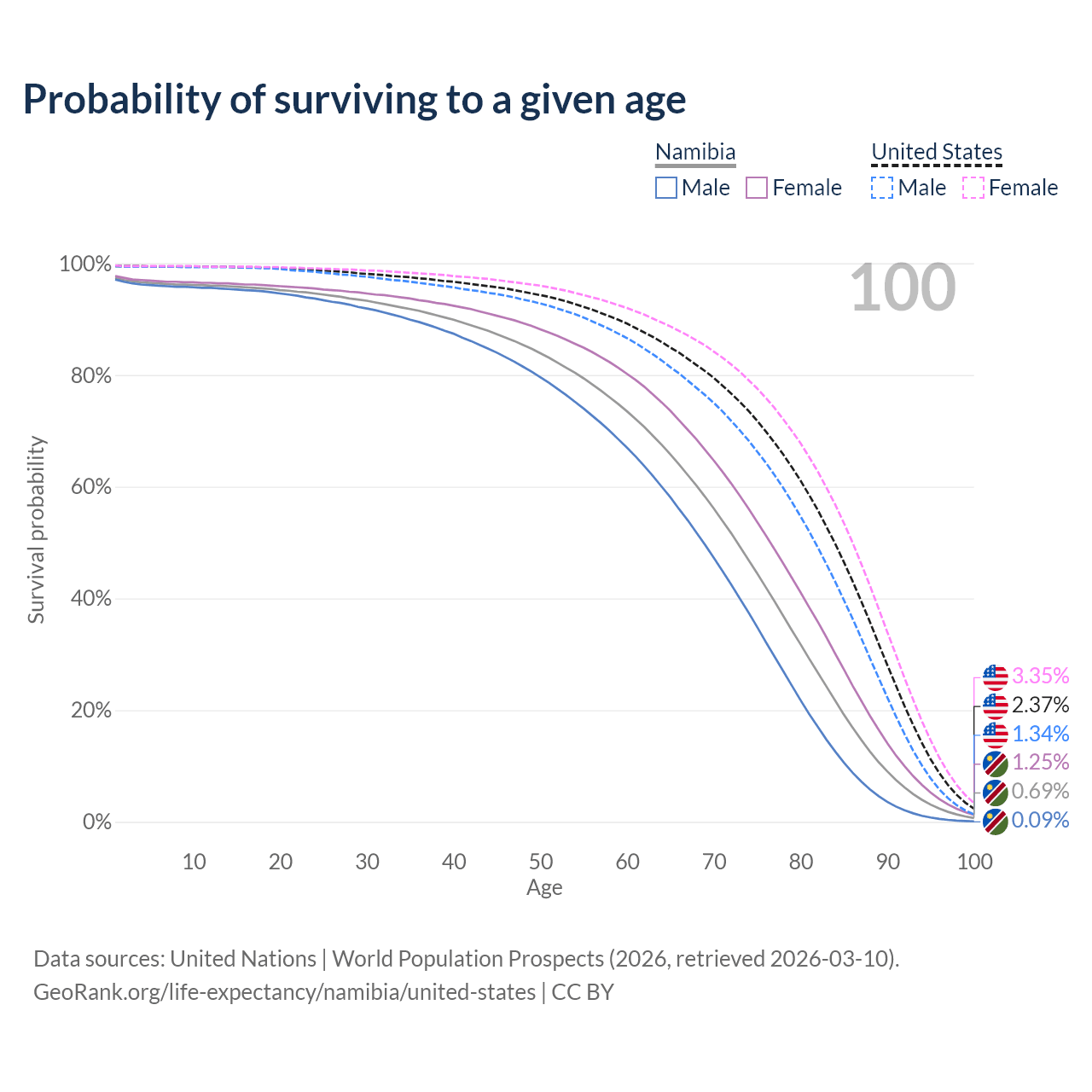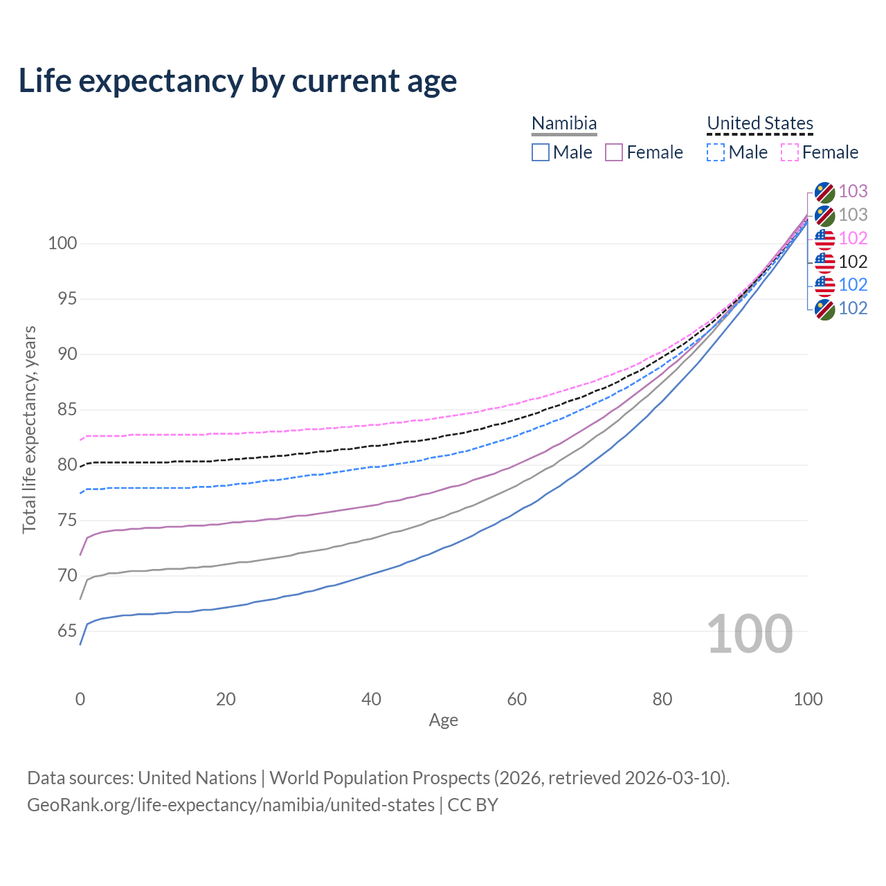 This life expectancy calculator shows the odds of living to 100, 95, 90, and below based on current age for both males and females in Namibia and the United States, along with mean and median age of death. The calculations are based on the 2026 life tables (actuarial tables) from the UN World Population Prospects.