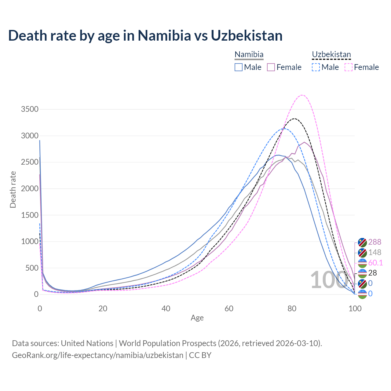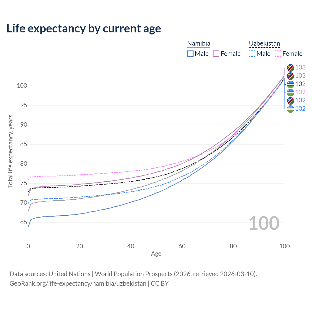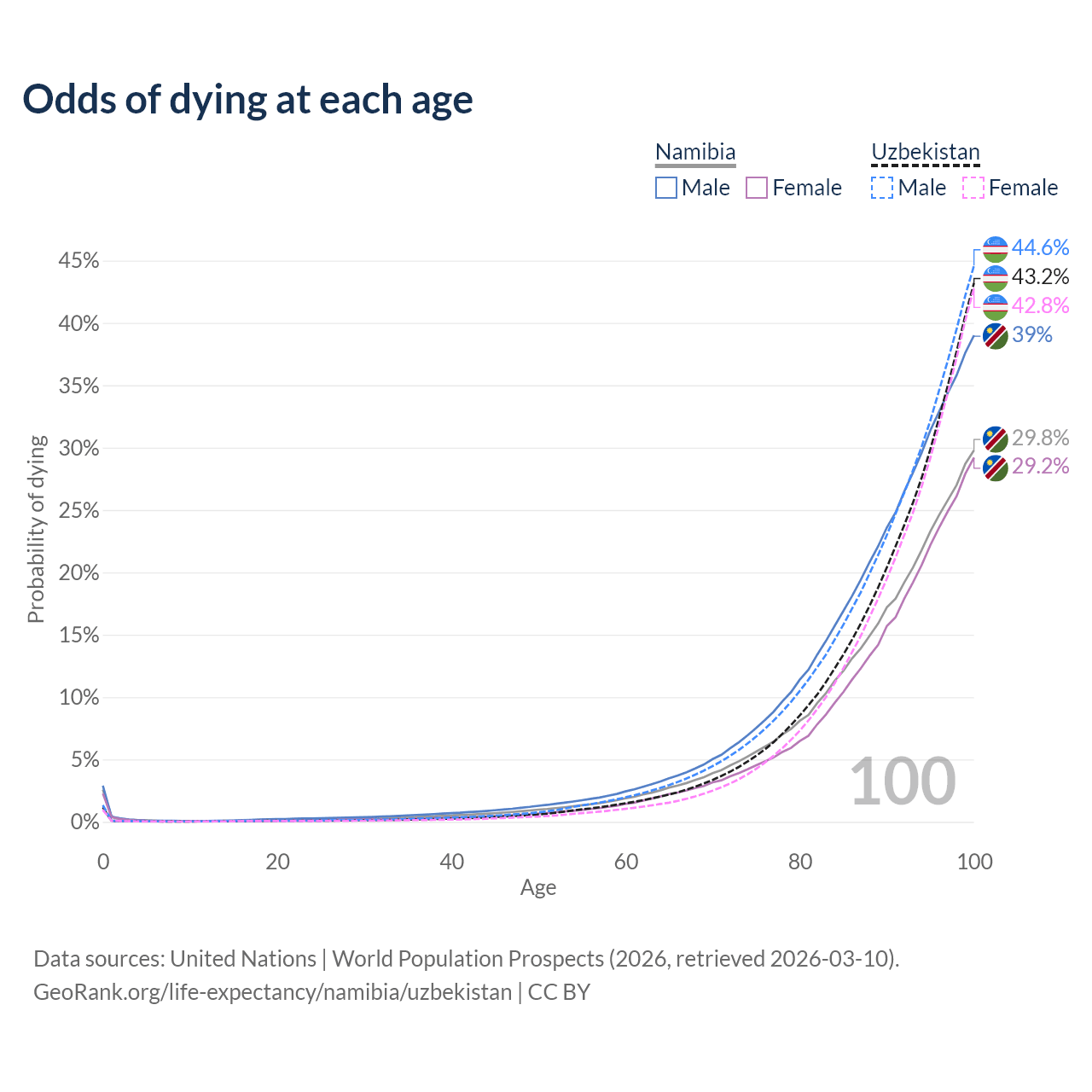 This life expectancy calculator shows the odds of living to 100, 95, 90, and below based on current age for both males and females in Namibia and Uzbekistan, along with mean and median age of death. The calculations are based on the 2026 life tables (actuarial tables) from the UN World Population Prospects.